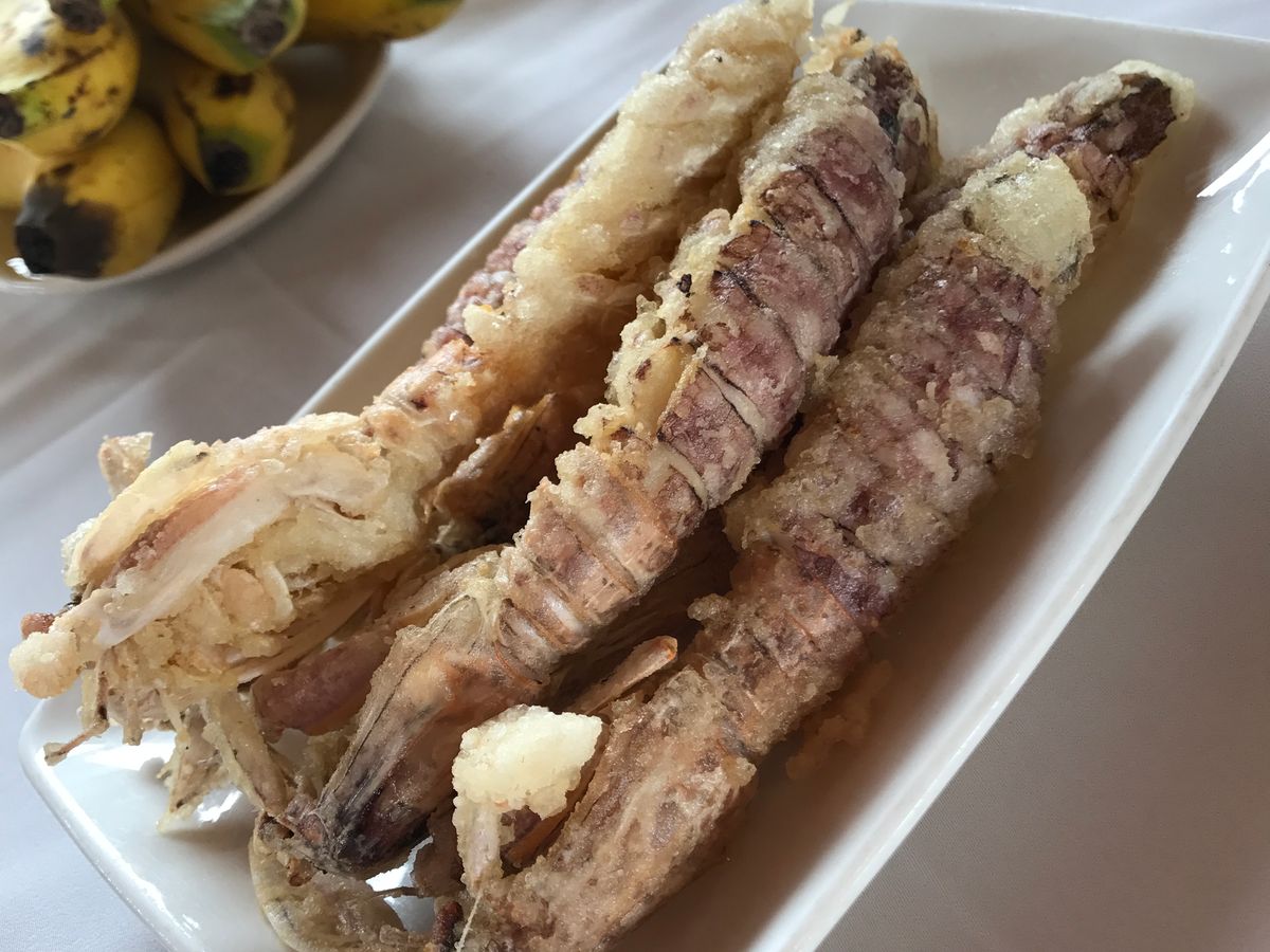 船が出航するとすぐに昼食の時間がはじまります。ボイルエビ、貝の炒め物、カニのつみれの詰物、春巻、イカの炒め物、魚のトマトソース炒め、ボイル野菜、ごはん、バナナ。思った以上にボリューミーな海鮮コースで味も日本人好みで美味しかったです。飲み物は有料(船上価格で現地にしては高いです)でお水も出てこないので皆、注文していました。ビールやワイン、ジュースがありました。ちゃんと冷えてます。