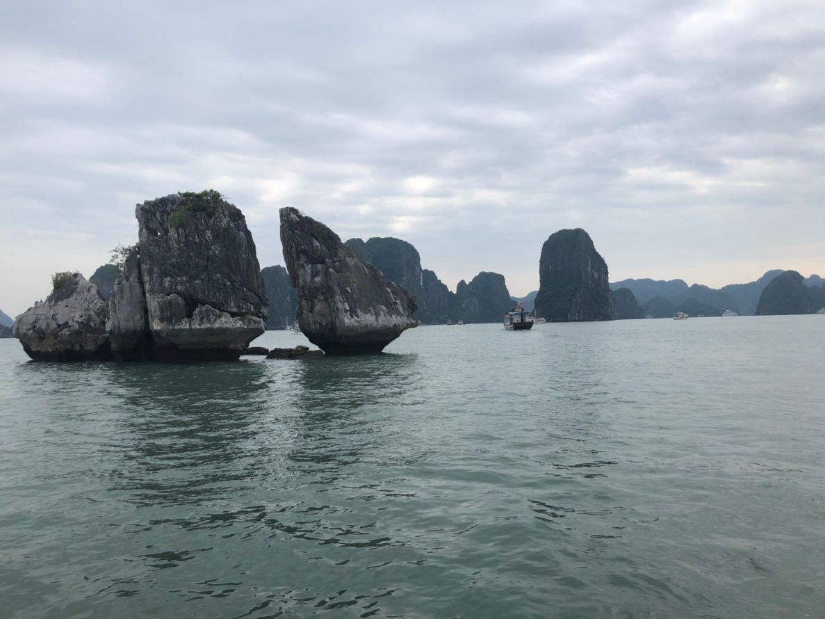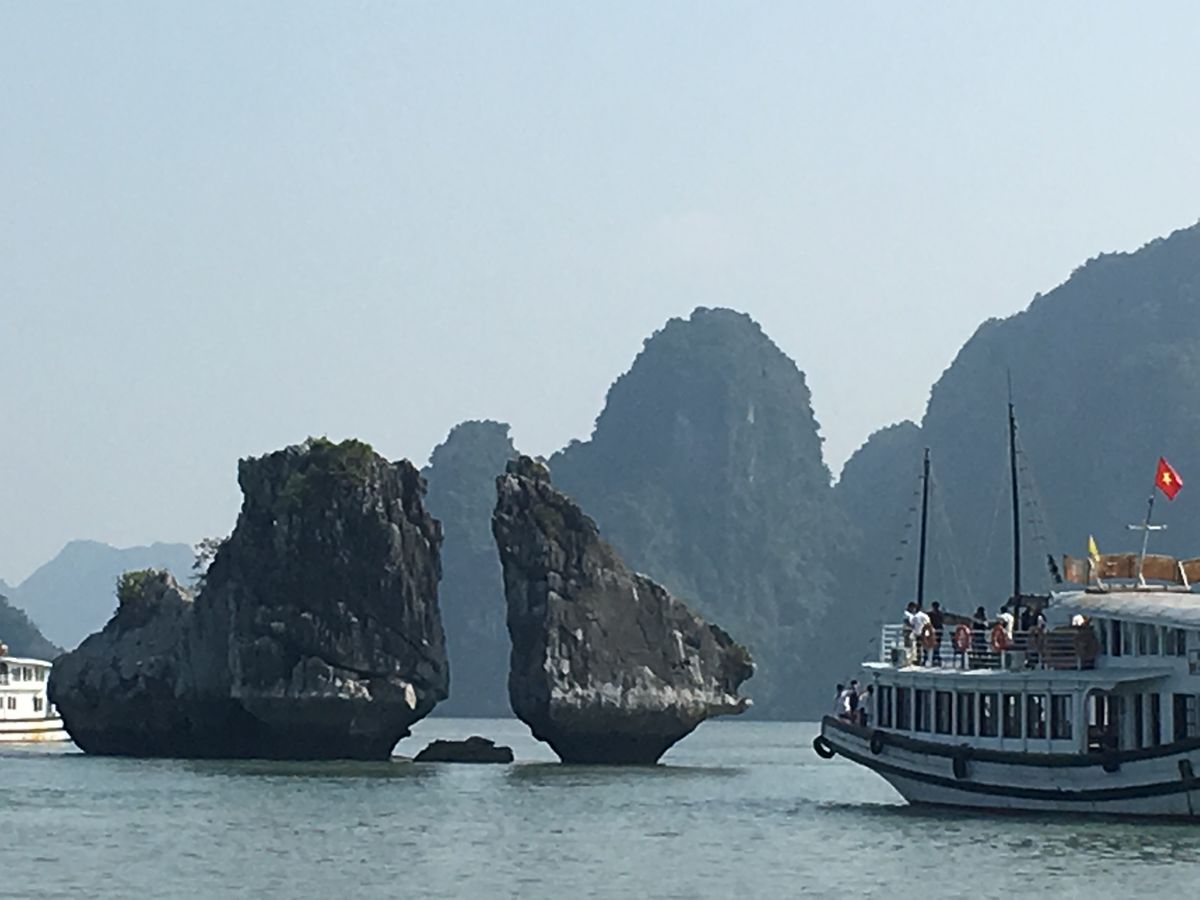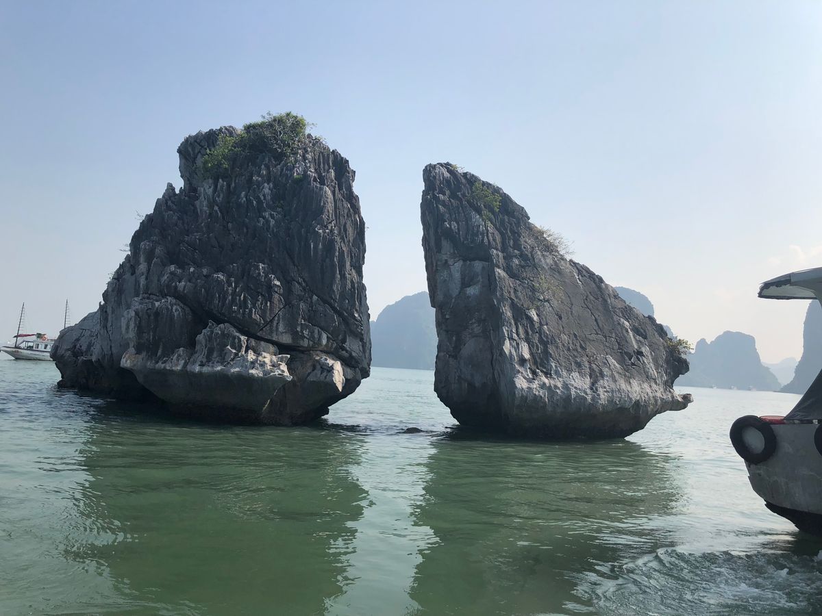 昼食をとりながらも、少人数だったので合間で自由に船の先に行って写真を撮ることができました。有名な夫婦岩には船が近づいてくれて、間近で写真を撮ることができました。ハロン湾自体にたくさんの船がいるのですれ違う船ともコミュニケーションをとれたりして、楽しかったです。船によってはこちらの3倍以上の人数が乗ってあるところもあったのでそう考えると少人数でラッキーでした。
