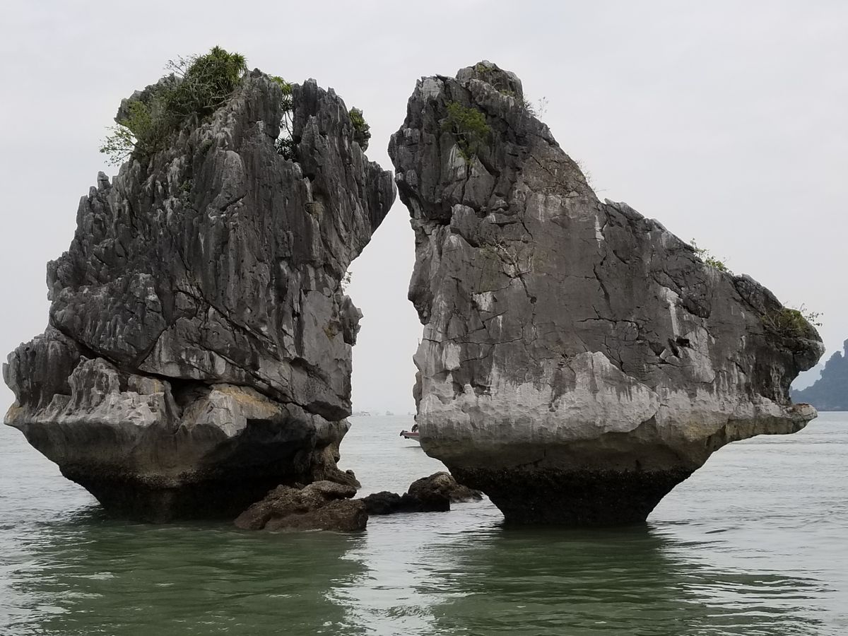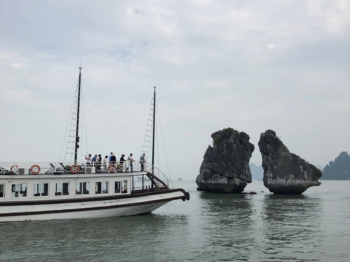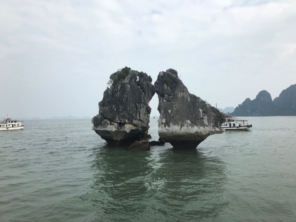 昼食をとりながらも、少人数だったので合間で自由に船の先に行って写真を撮ることができました。有名な夫婦岩には船が近づいてくれて、間近で写真を撮ることができました。ハロン湾自体にたくさんの船がいるのですれ違う船ともコミュニケーションをとれたりして、楽しかったです。船によってはこちらの3倍以上の人数が乗ってあるところもあったのでそう考えると少人数でラッキーでした。