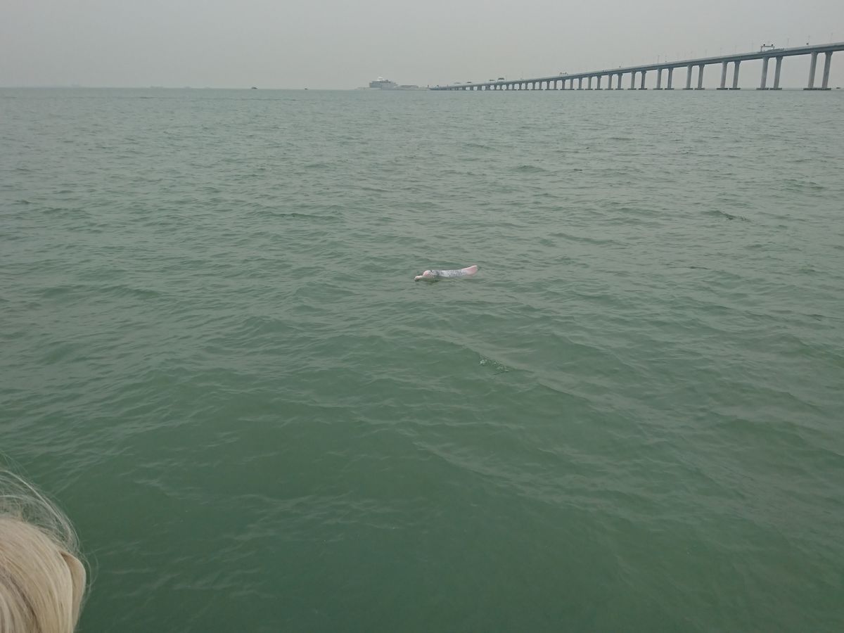空港を横目に、大澳方面に向かう途中でフェリーが停止し、ピンクドルフィン発見!