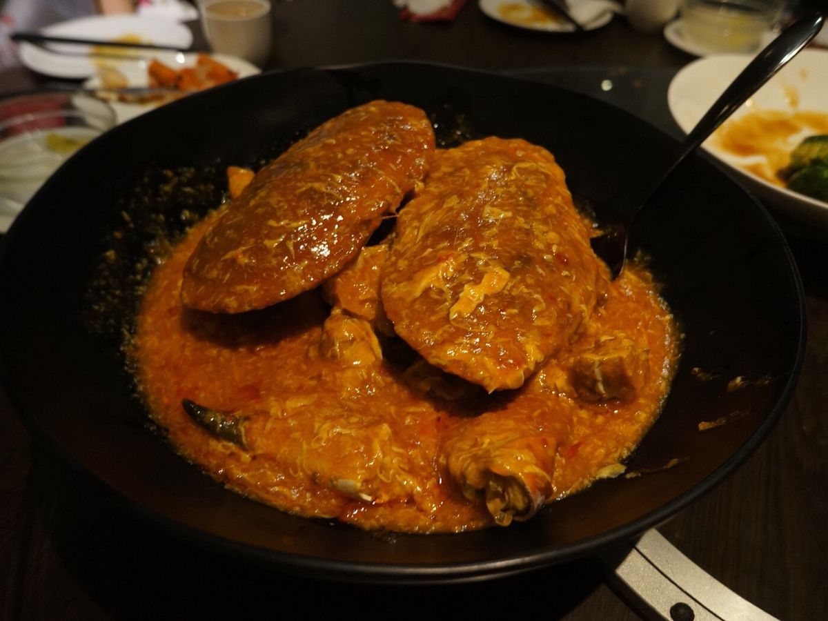 料理は スープ⇒海老⇒白身魚のフライ⇒ブロッコリーの炒め物⇒チリクラブ⇒チャーハン⇒デザート(ココナッツ味の生菓子)