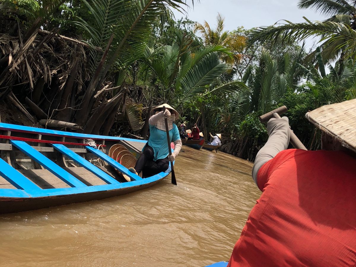 手漕ぎボートでは、ベトナムの帽子をかぶって雰囲気満点で自然を満喫。ボートをこぐ人が、片道2キロだと教えてくれました。