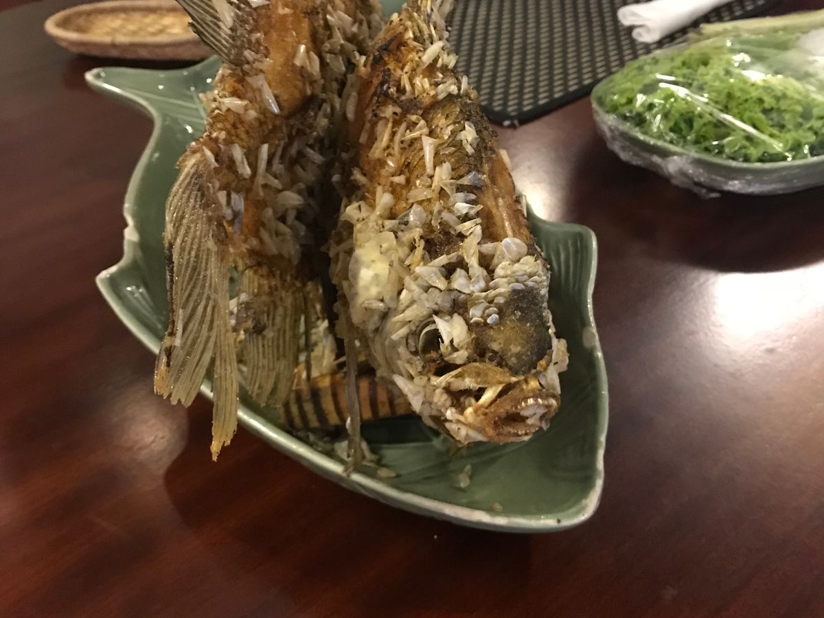 今回の旅行で一番楽しみにしていました。指定ホテルでピックアップして頂き目的地のミトーへ。メコン川は雨季は今回の茶色、乾季は緑色になるとのこと。ハチミツ農園で休憩し、ニシキヘビを首にかけたり、ココナッツキャンディの工場見学、メコンデルタ川クルーズは狭いながらも楽しかったです。その後はランチタイムと気になっていたエレファントイヤーフィッシュの登場。生春巻きにしてお店の人が巻いてくれました。味付けは臭みもなくあっさりしています。他にもあげ春巻き、そうめん等でました。