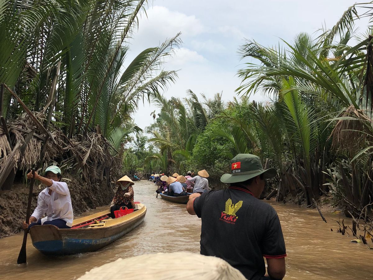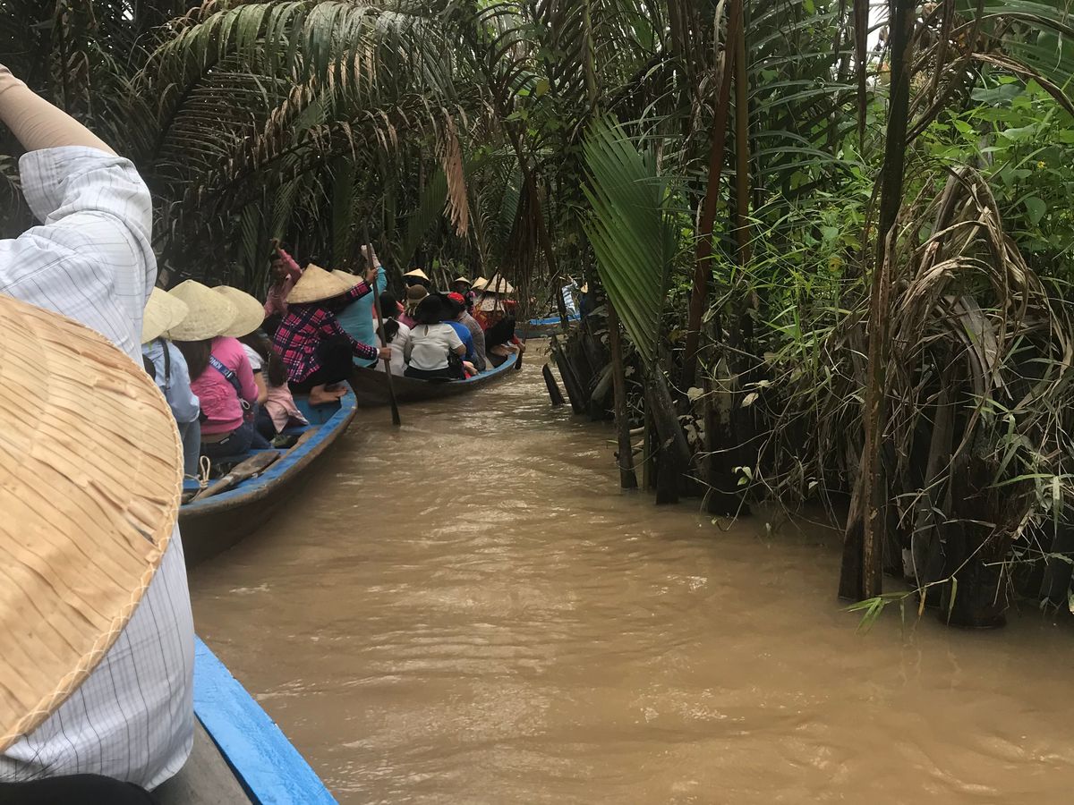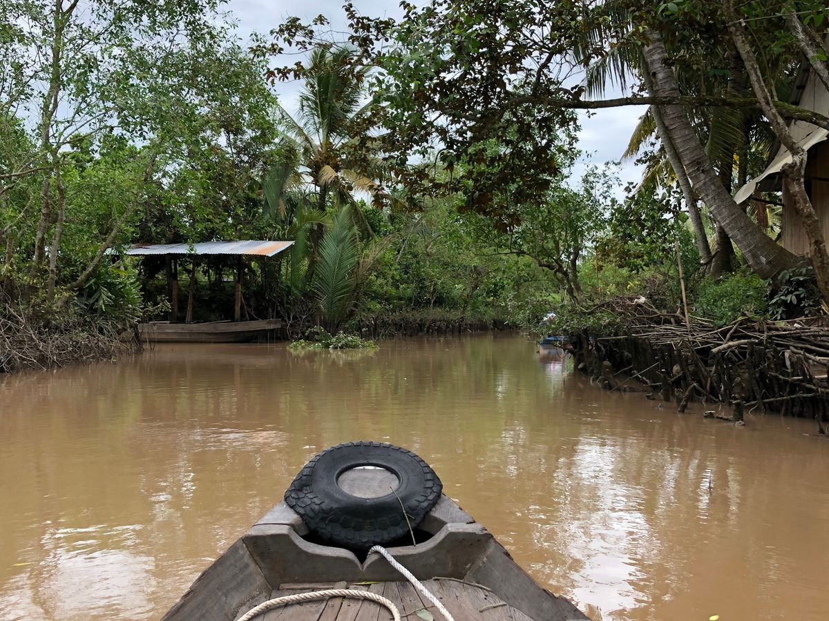 メコン川手漕ぎボートは思った以上に日射しが強いので帽子や上着など直射日光を避けられるものがあればいいと思います。