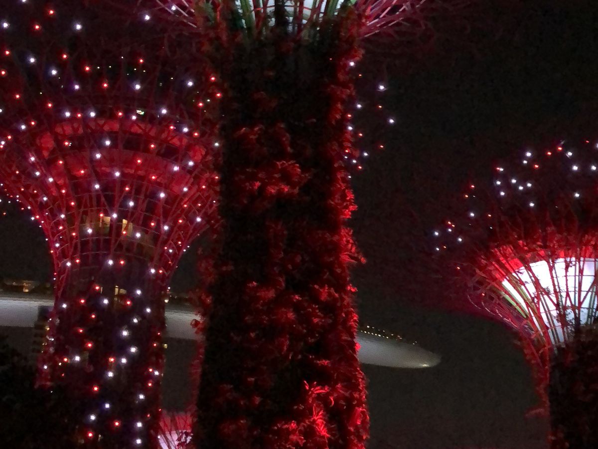 そこからバスまで歩いたのですが、けっこう距離があり、ガーデンバイザベイのショーは着いたらもう始まってしまってました。タクシーや、バスが多く、すごい人でしたが、色の組み合わせもすごく綺麗で、ウットリ!