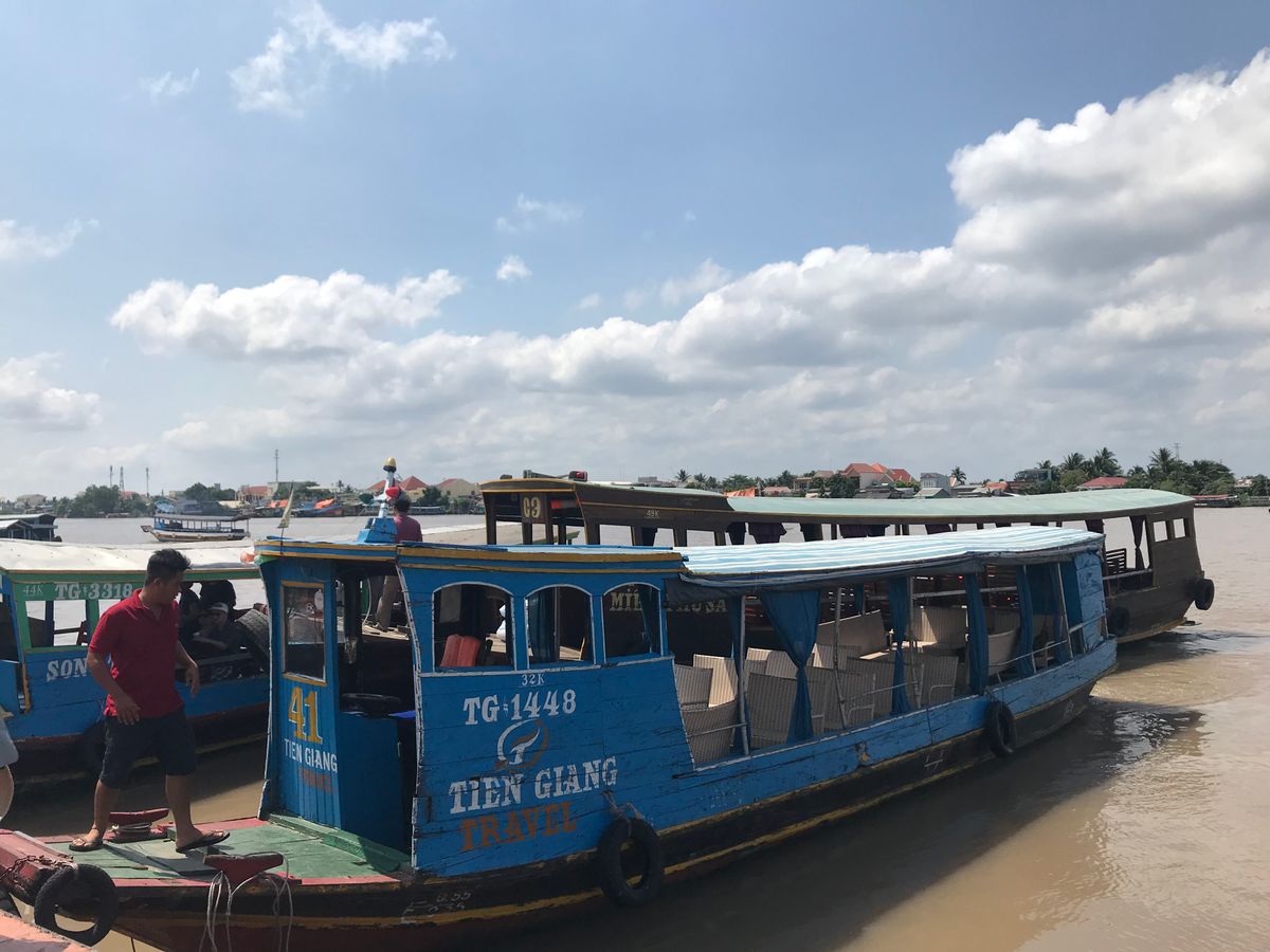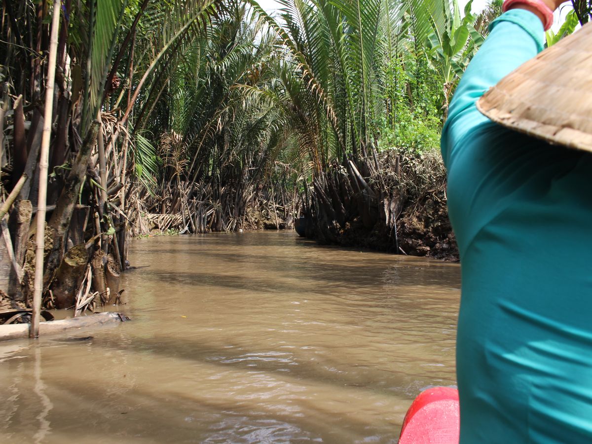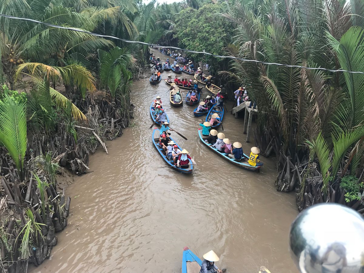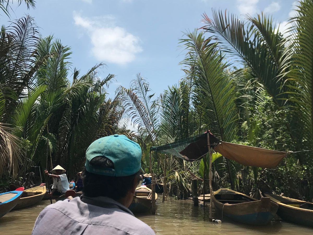 ユニコーン島をガイドさんと散策して、ハチミツ、ヘビ、ココナッツキャンディ、フルーツ、不思議な演奏、、と充実の内容のあと、クライマックスの手漕ぎボート!ベトナムの帽子?笠を貸してくれて20分くらいの川くだり。担当してくれた船頭さんがスゴいパワフルでどの船よりもスピードを出して進んで、どんどん前の船を抜いていったので楽しかったです!