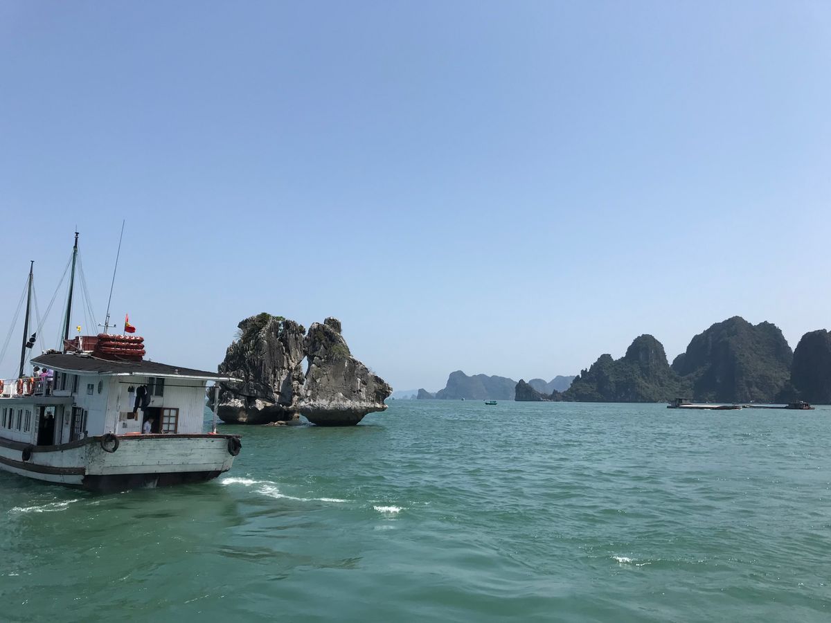 車で3時間半ぐらいでハロン湾につきます、すぐクルーズ船にのりそこでお昼を食べます。メニューは野菜のガーリック炒めやソフトシェルやアサリの炒めたものなど。別途500円でシャコとハマグリを焼いて食べれます。