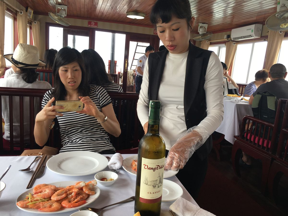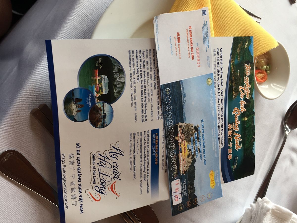 ガイドさんがとても親切で優しい方でした。料理は、シーフード料理を同じテーブルのみんなで取り分けて食べるような形式で、楽しかったです。船の上で食事をしながら、ハロン湾をすすみ、その後は、洞窟に入って鍾乳洞を見ました。鍾乳洞は、たくさん階段があるので、靴を履いていった方がいいと思います。また、行き帰りのバスは、結構長いのですが、途中休憩で、お土産ショップによります。色々なものが置いてあるので、楽しめると思います。