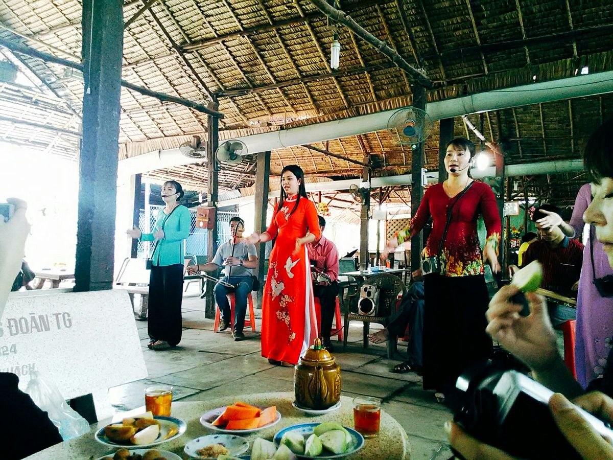 その後、綺麗なフルーツの試食&お茶を飲みながらアオザイ姿のお姉さん達の歌を聞きました。