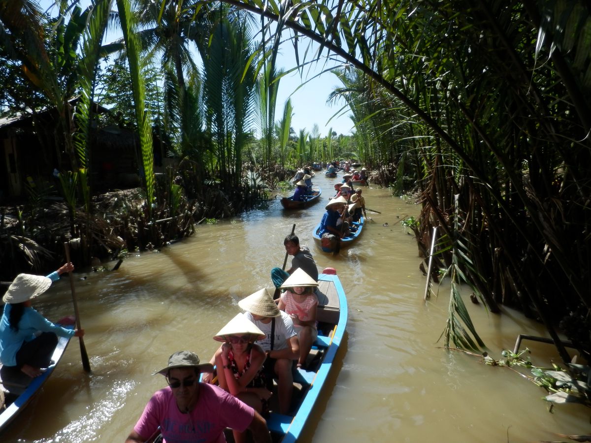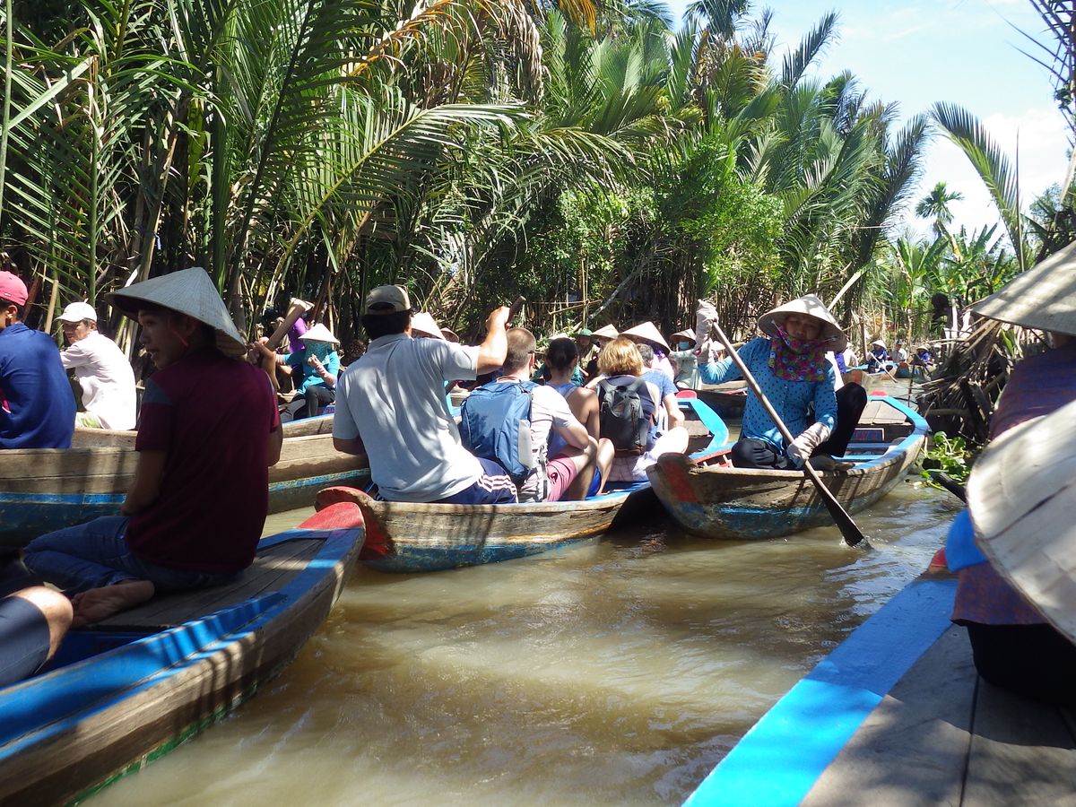 私は60代のおばさんです、地図を片手に出かけようと思ってもやはり無理。インターネットで見てこのツアーに参加しました。ホテルに迎えに来てくれてホントに楽ちんです。メコン川の名前は知っていても子供の頃の教科書で覚えたぐらいの知識しかありません。現地に到着するまで添乗員さんの話を聞きながらバスの窓から見える青々とした稲田と刈られた稲田、見たことのない景色です、期待感が膨らみます。目の前に現れたメコン川、船に乗りながら「今、私はあのメコン川にいるのだ」と感動してしまいました。船を降り歩きながら龍眼、ヤシの実、ジャックフルーツ、小さな青いバナナ等日本では馴染み薄い果物の木を見ながらはちみつ茶で一服、龍眼の花の蜜だそうです。ジャングル体験しながら同僚から聞いていたあのココナッツキャンディー工場へ到着、買い物客がとても多いです。脂肪燃焼にいいと聞いていたので早速購入、果物の試食を終えてさあジャングルクルーズです。かんこうきゃくがおおく、すれちがうときはすりるまんてんでした。昼食は象耳魚です、店内は広く清々しい、美味しかったです。夜は水上人形劇とディナークルーズへ、人形劇はとてもびっくりです、一度見てください。ディナークルーズも食事が美味しく、景色も素敵でした。一日しっかり遊べて満喫した時間を過ごせました。女性の方へトイレもきれいでした。どうもありがとうございました。