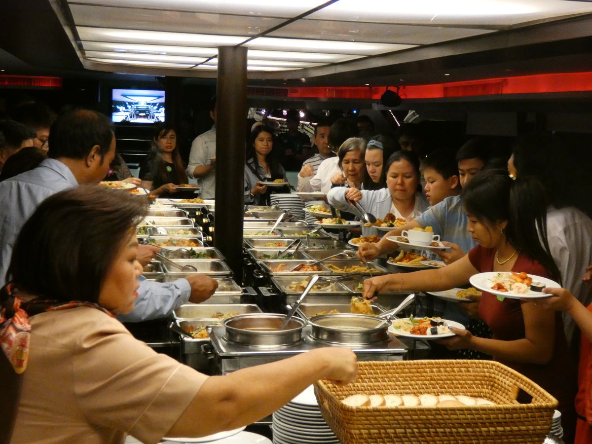 リバーシティのチケット引換所が分かりずらい!チケットをもらって、乗り場も人が大勢の観光客で溢れかえっていて分かりにくい!それを除けば、船内も綺麗で食事も美味しかったです。食事はタイ料理ですが、観光客向けなのかあまり辛く有りませんでした。デザートにケーキまであって、とても美味しくて良かったです。室内から夜景は見にくいですが、デッキにも出れるので問題なしです。このお値段でのんびり夜景鑑賞、お得です‼︎