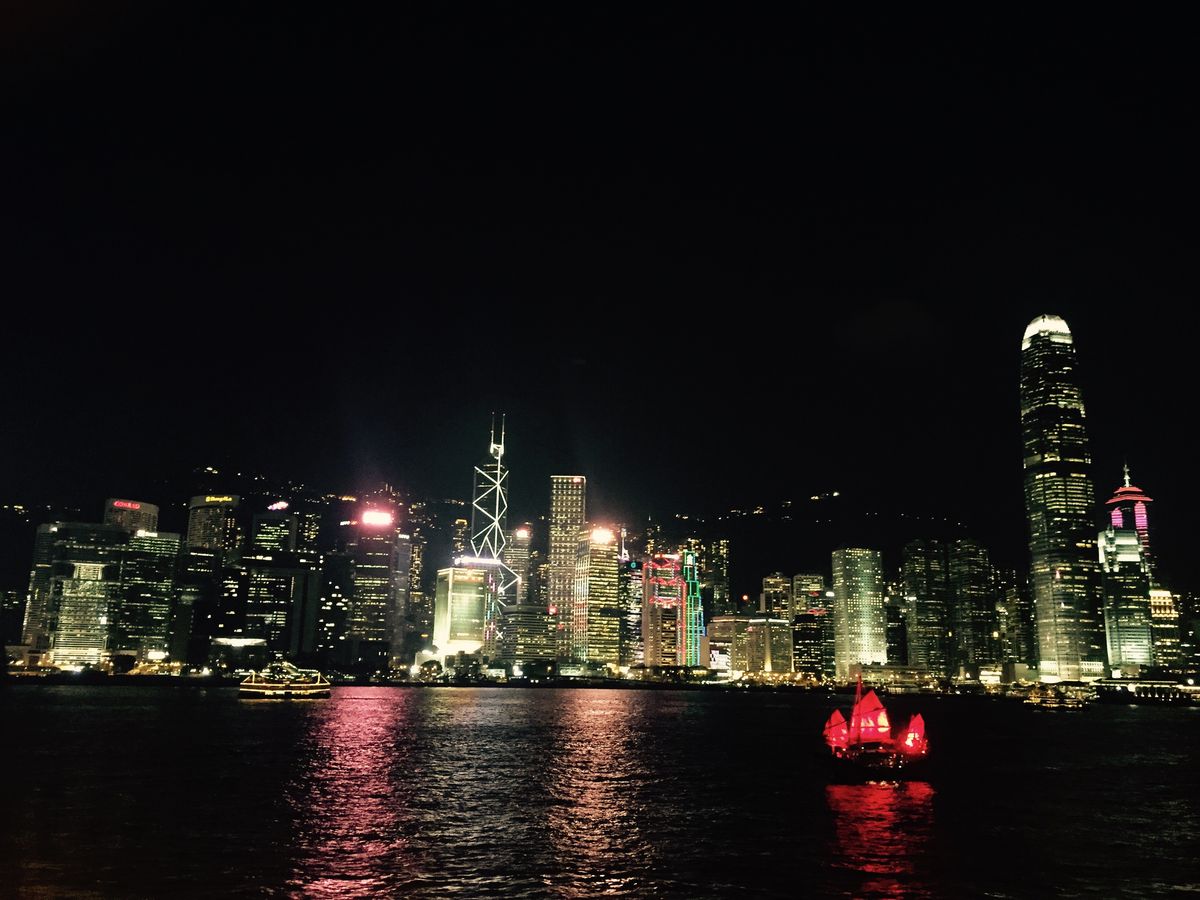 河を行きかう他船の景色が美しく経済の躍動を感じる近代意的な高層ビル群の夜景も