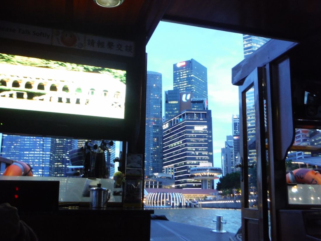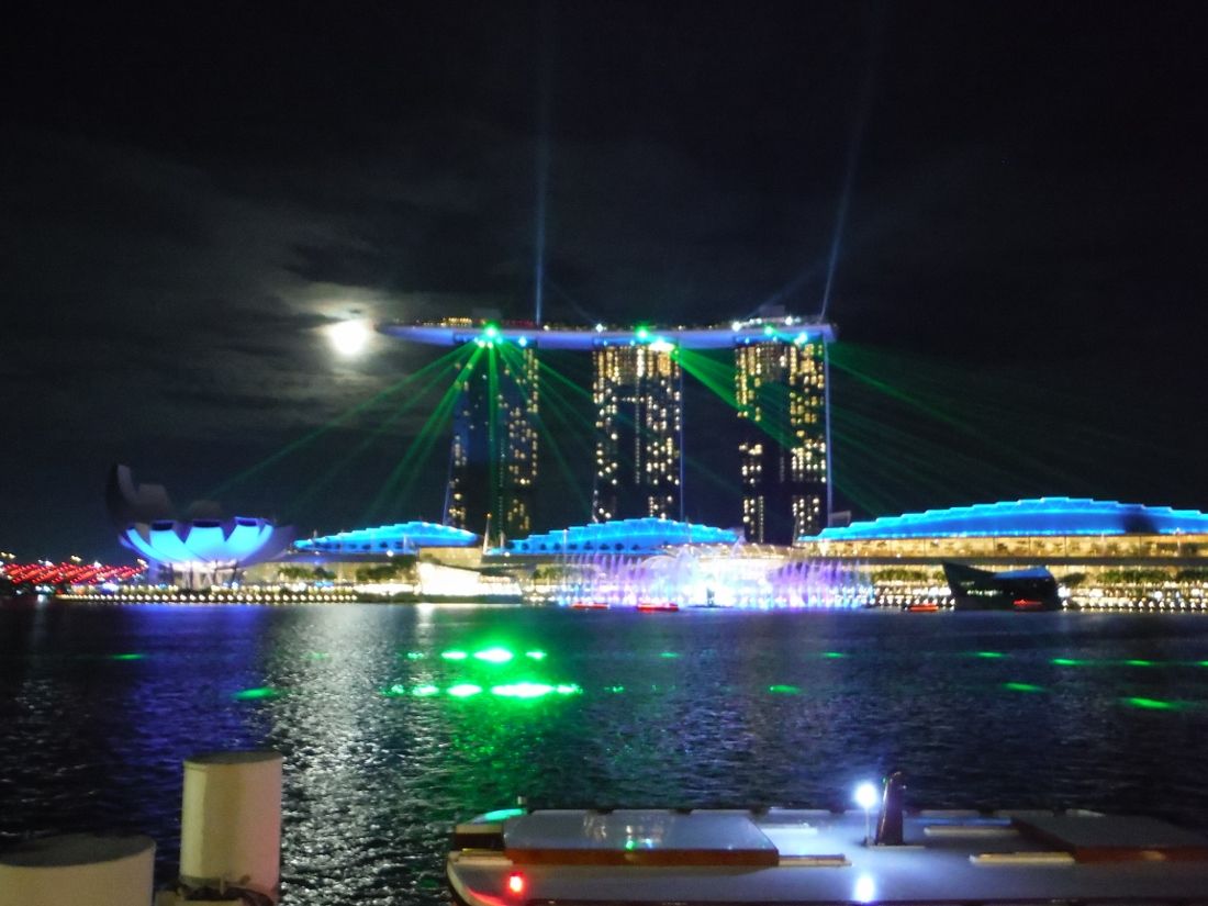 ピックアップに時間を取られ、食事時間が短くなってしまいましたが、クルーズにも間に合って、マーライオンのところからマリーナ・ベイ・サンズの光のショーを見ました。