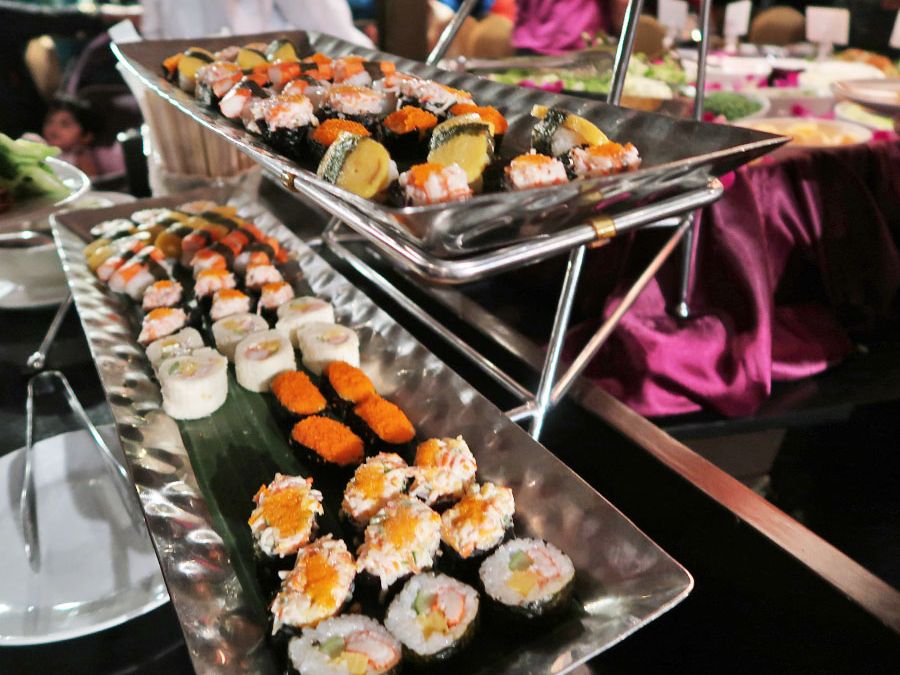 ビュッフェのお食事はタイ料理を中心としたインターナショナルブッフェで、お寿司やパスタ、ラザニア、炒め物、サラダなど、辛くないお料理も含まれていました。2階船尾の方に、麺をその場で作ってくれるコーナーがあります。