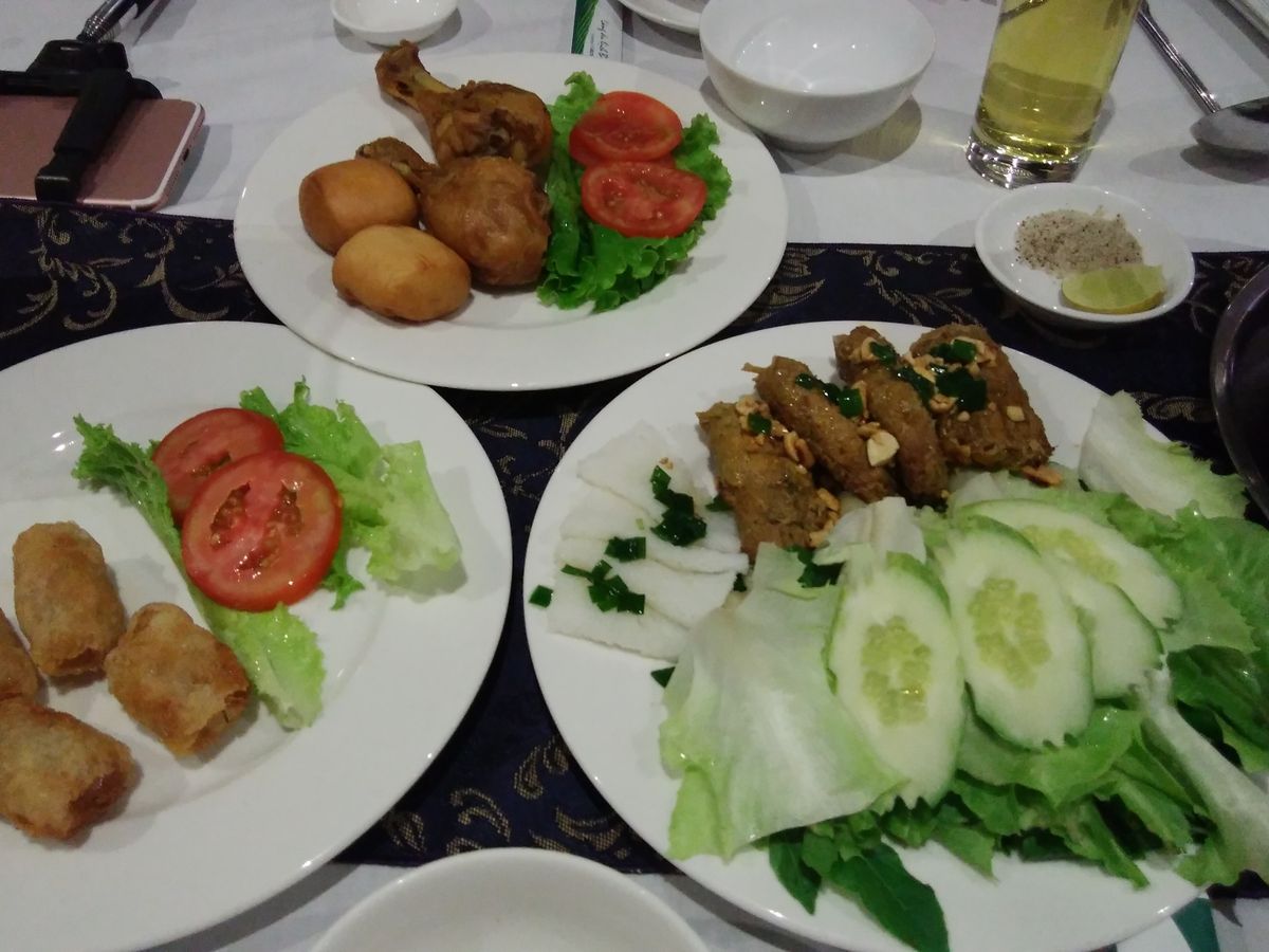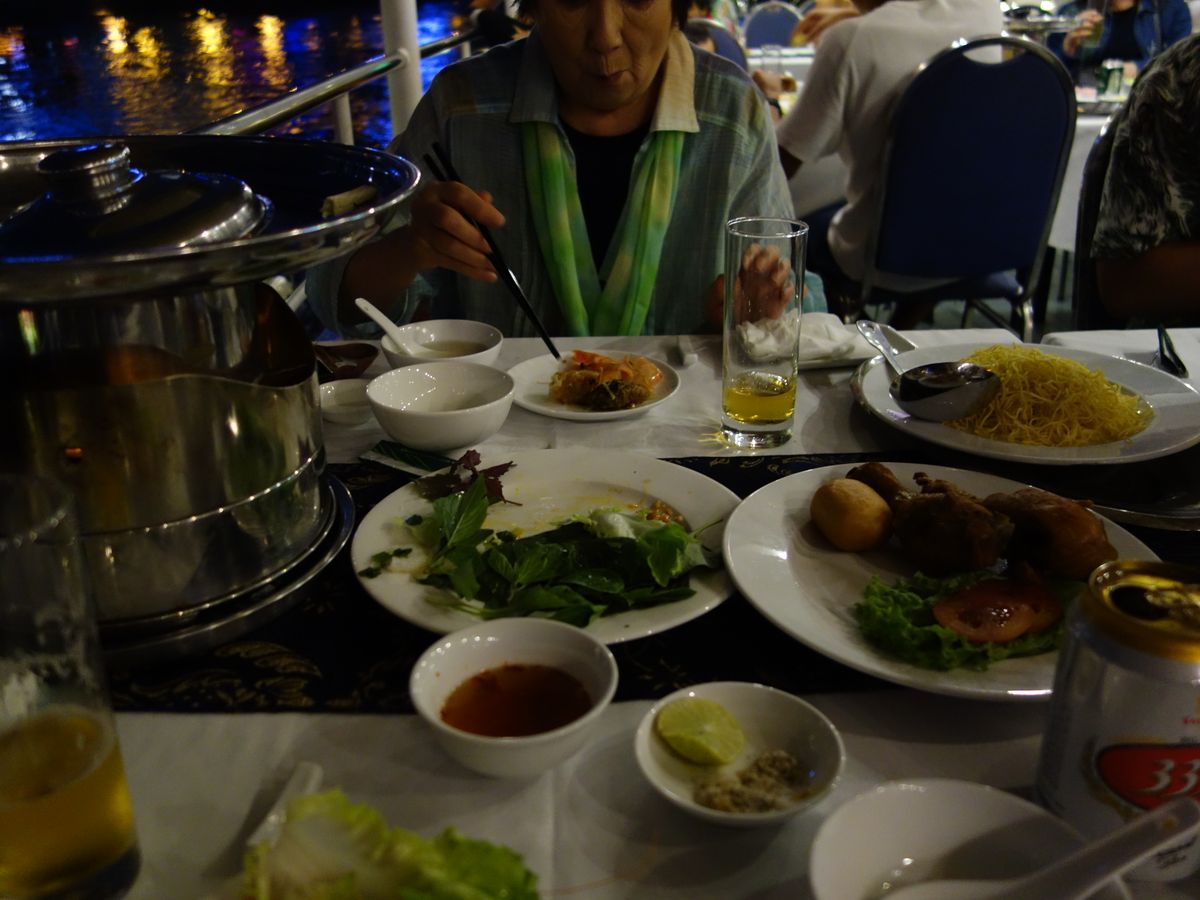 サイゴン川ディナークルーズのメニューは揚げ春巻、硬めのチキン、香辛料がかかった牛肉の巻いたもの、蒸した海老、野菜とお肉と海老の入ったお鍋(最後に麺を入れる)、フルーツ等。旅行中にお腹を壊すのが恐くて生野菜が食べられなったので、お鍋の中で煮た野菜を食べられて嬉しかった。味は塩ラーメンみたいでまぁまぁ美味しかったかな。