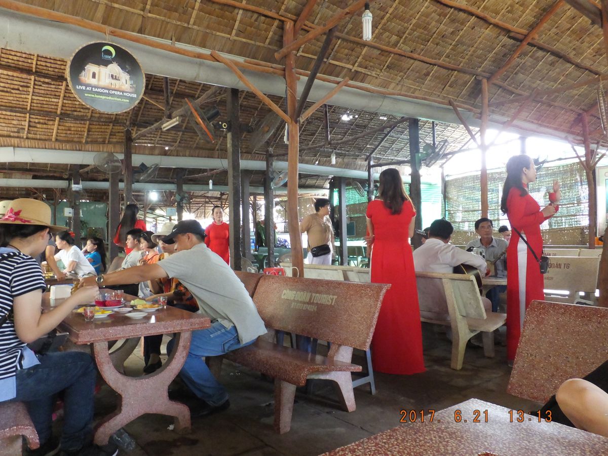 次は手漕ぎボートのデルタクルーズへ。ベトナム伝統の麦わら帽子ノンラーをお借りしてパチリ撮影。帰りの船に乗るとここでも本物のココナツジュースが。飲んだり、食べたり楽しんだミトーを後にして本土に上陸後、バスで庭の素敵なレストランへ移動。象耳魚は生春巻きにくるんでパクリ。美味。丸い揚げもちはボールみたいで見た目が楽しく美味。フォーとは微妙に異なるフーティユ、デザートもついて、50分では足りないくらい食べ続けました。店のエアコンの効きがいまいちで暑かったのがマイナスか。笑