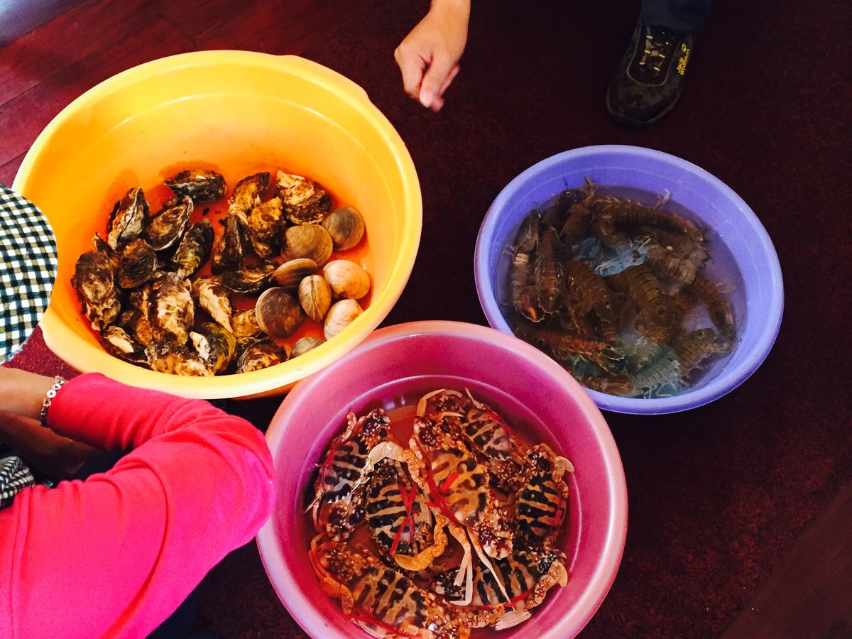お昼にハロン湾に到着。早速乗船しシーフードの昼食になります。タイミング良く漁師の船が近づいてきてシャコ、蟹、牡蠣など生きているものをその場で購入し、料理してもらえます。漁師さんへの支払いのみ現金で、あとは飲み物代が別料金になります。充実したコースでお腹いっぱいになりました。