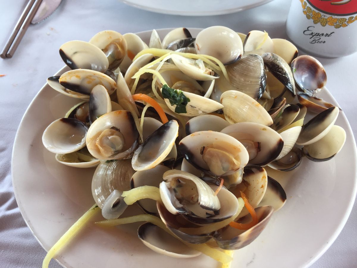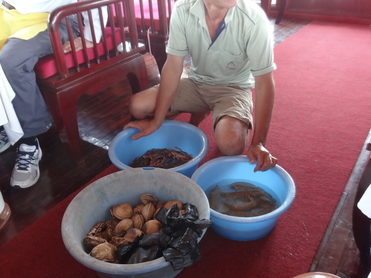 名所の島に近づいた頃、カニやシャコ、牡蠣、ハマグリの売り子が乗船。買った海鮮は船の調理場で「無料調理」との事でアレコレと購入。ハノイのスーパーで見かけた大ぶりサザエの欠品はちょっと残念!