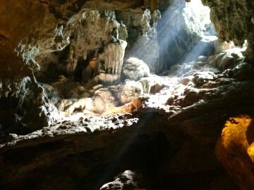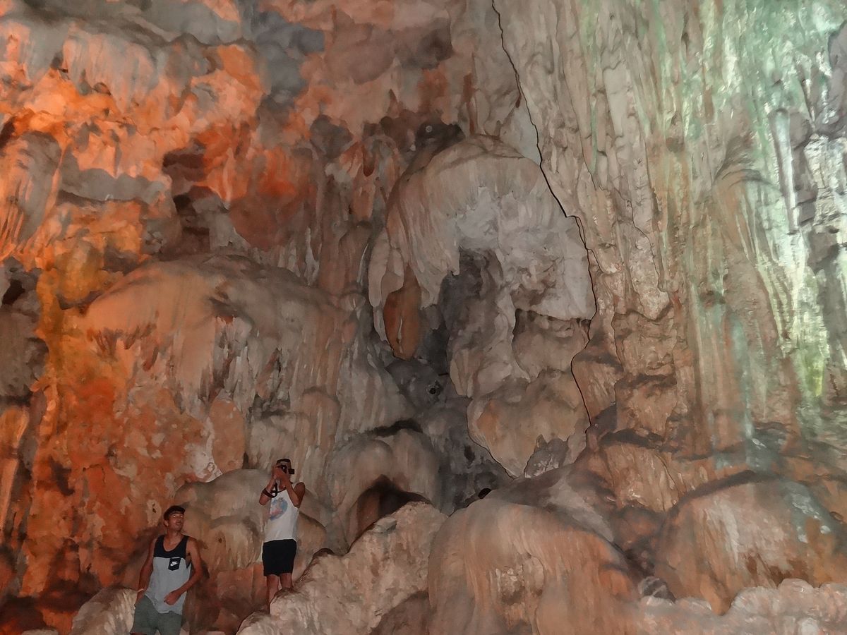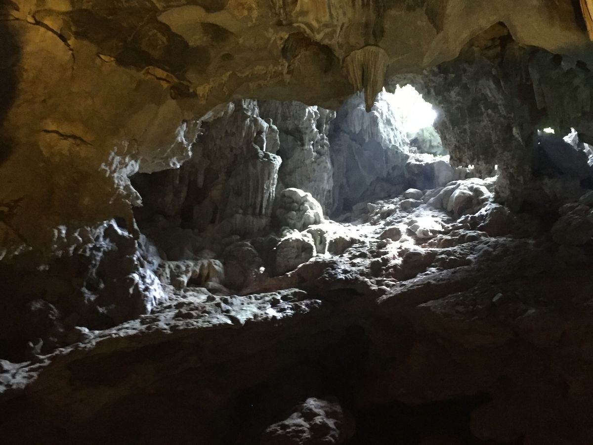 昼食を完食し、クルーズの終盤に差し掛かった頃、入り江のようになった船着き場で停船。船を降り、階段を登って鍾乳洞に入ります。この時、乗船時に受け取った切符を持っていかないと鍾乳洞には入れません。くれぐれもお忘れなく。鍾乳洞は水が滴り涼しい日本のイメージですが立ち寄ったティエンクン鍾乳洞は「暑い!」。しかも入り口を入った瞬間から巨大な空洞が広がっており圧倒されます。日本人が知っている日本の鍾乳洞のような「雫がポタポタ」、「肌寒さ」や「繊細さ」はありません。ひたすらダイナミック。乾期のため水が干上がってしまった鍾乳洞はそれはそれで一興です。