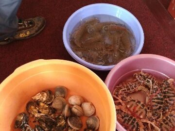 途中で漁師さんが新鮮なカニやシャコ、貝などを売りに来て、