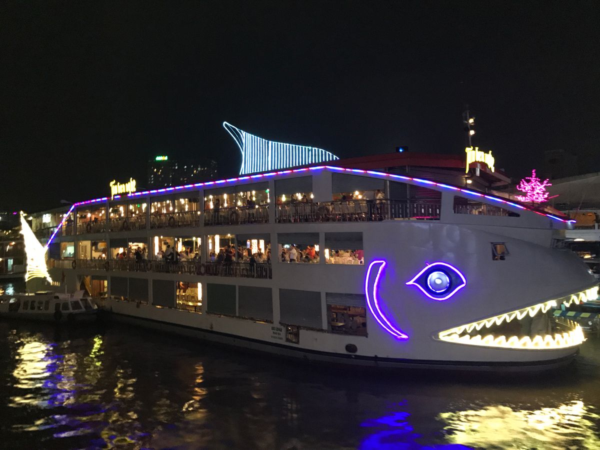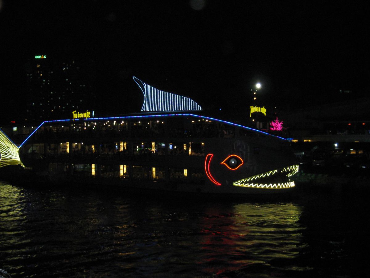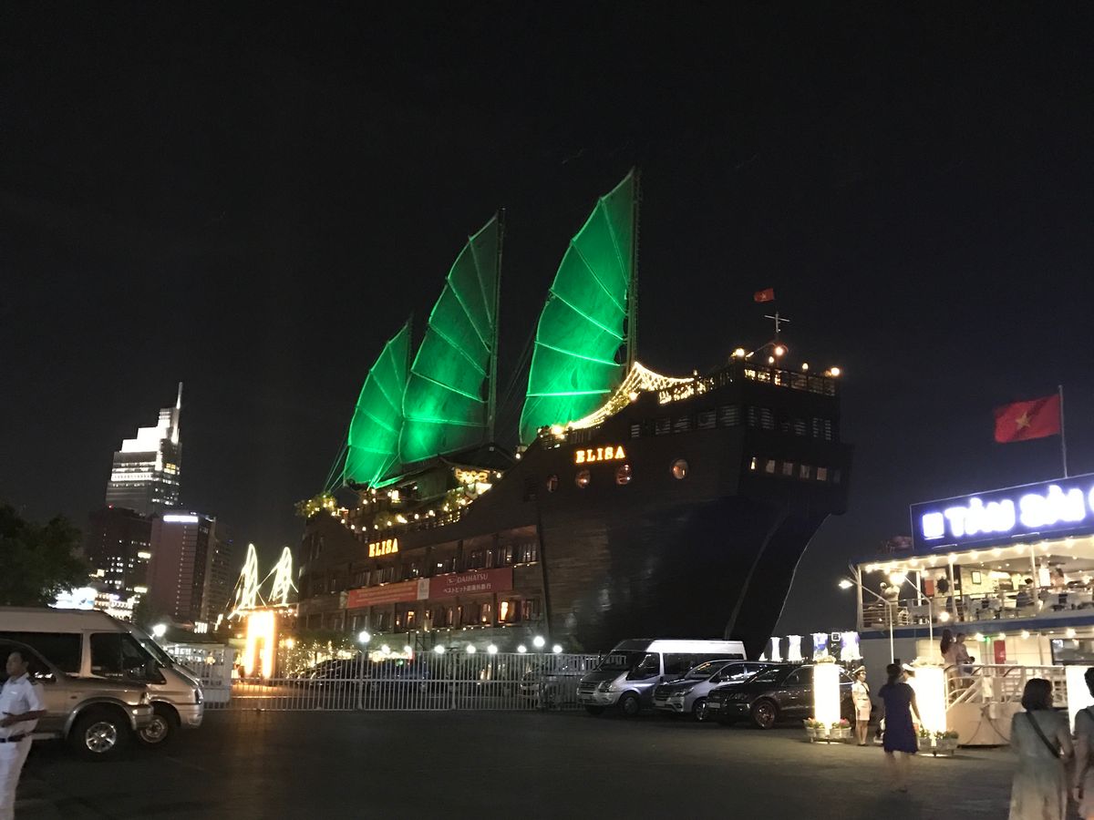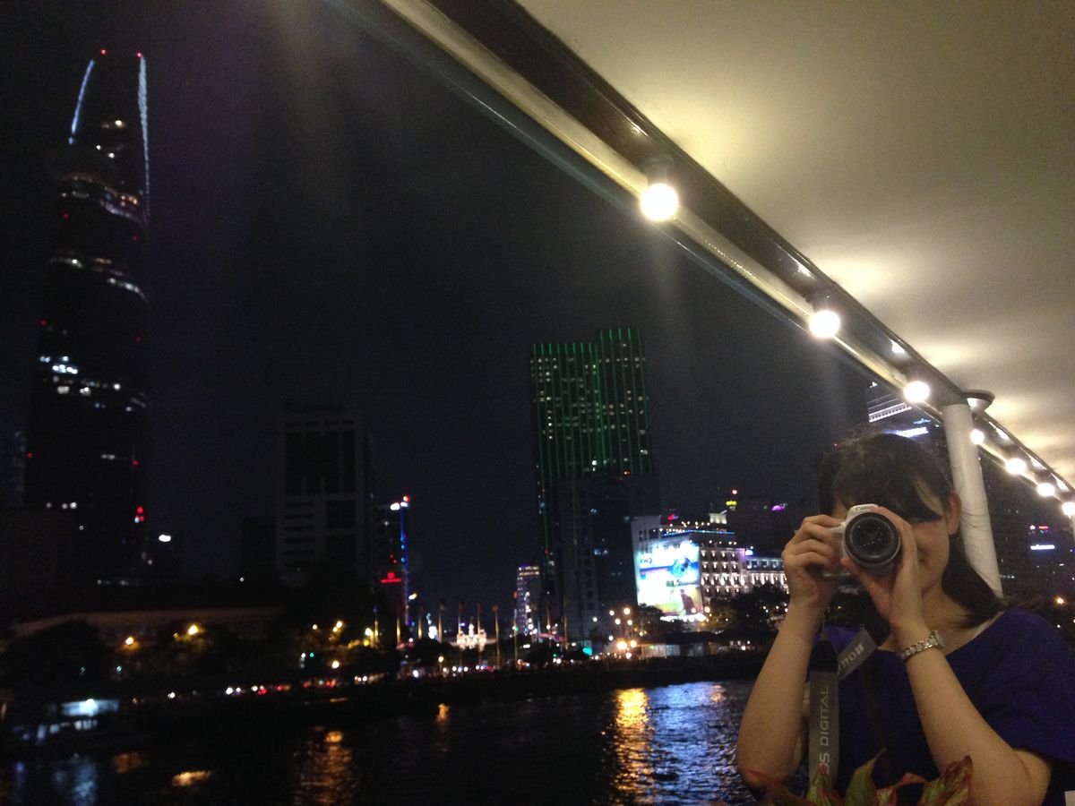 つぎにナイトクルーズ。ホーチミン市内の川まで送迎してくださいます。到着するとナイトクルーズをする大きな立派な船にまで着いてきて席まで案内し、飲み物の注文までしてくれます。ご飯はコースで事前に注文してあり、大きな蒸し鍋に麺が入ったもの、揚げ春巻き、揚げまんじゅう、お肉、ボイルしたエビ、ゼリーのデザートをコンロなどを囲み食べます。鍋だけでお腹一杯です。お支払いはドリンクの分だけです。一番最上階の席から夜景を眺めながらのクルーズなので、景色ばかり見ていると直ぐに時間になってしまいます。楽しかったです。帰りはガイドさんがクルーザーまでまた迎えに来てくれて、自分のホテルまで送迎してくれました。とても親切なガイドさんばかりなのでオススメです。