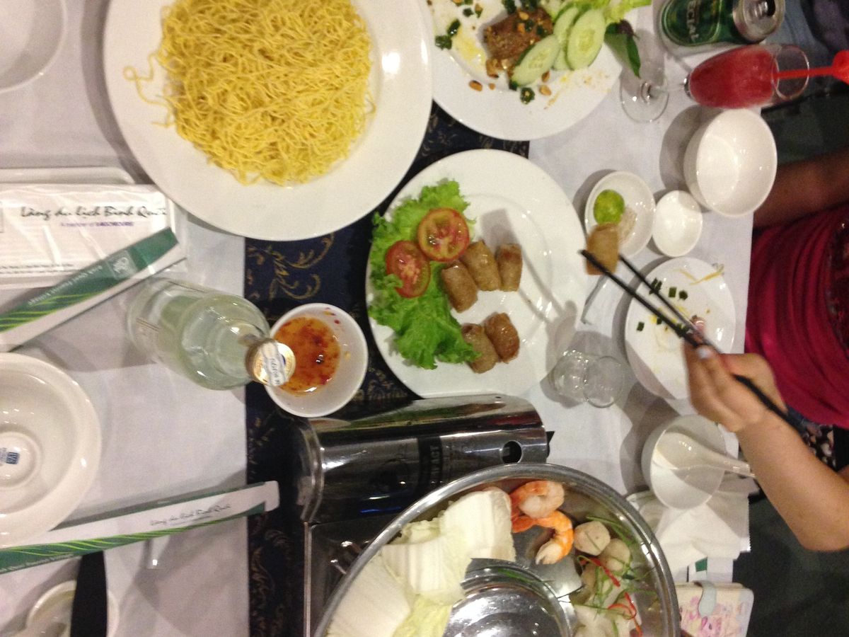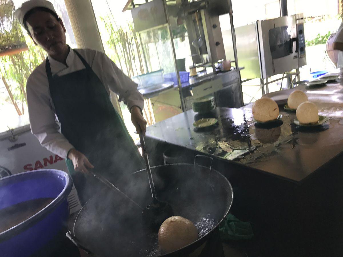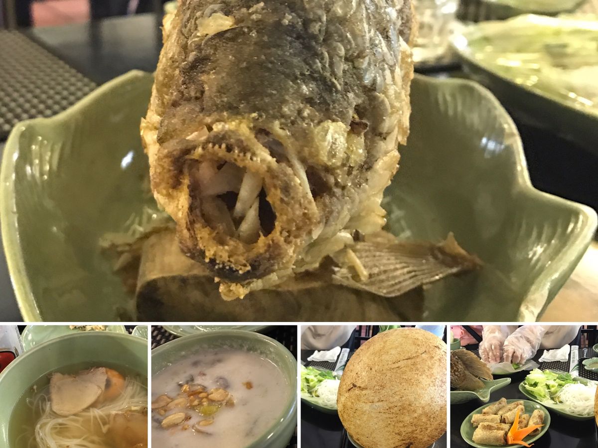 お昼ご飯は大きなレストランでコース料理も楽しみます。すごく大きなお魚を目の前で調理して取り分けで、生春巻きを作ってくださいます。また顔よりずっと大きなふうせん餅を切り分けてくれたり、揚げ春巻き、フォー、チェーが食べれます。お腹は一杯です。