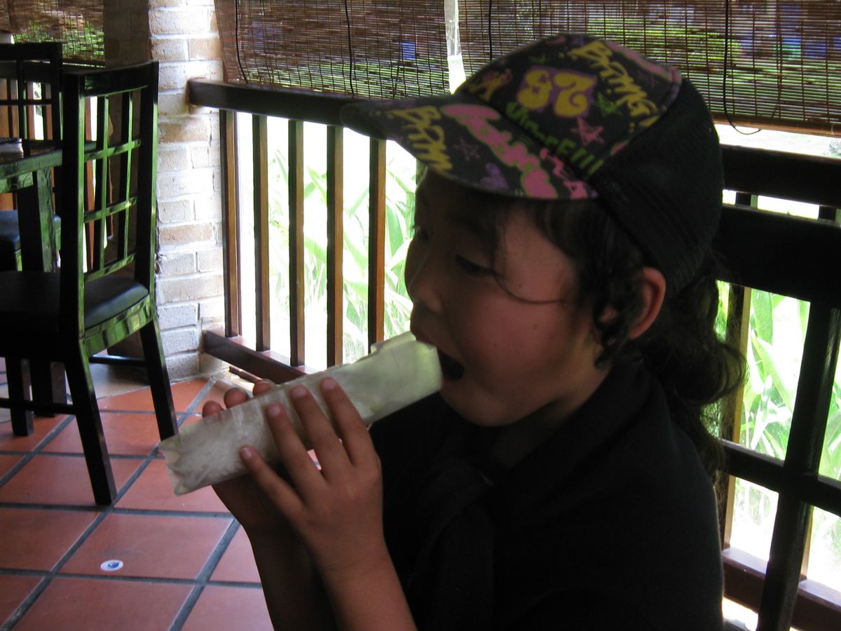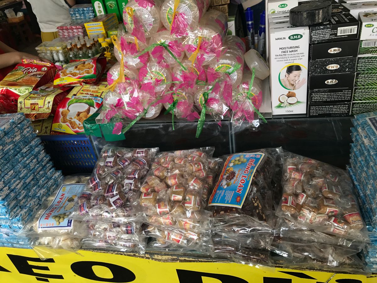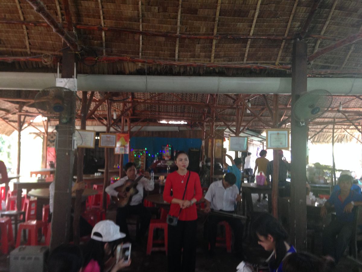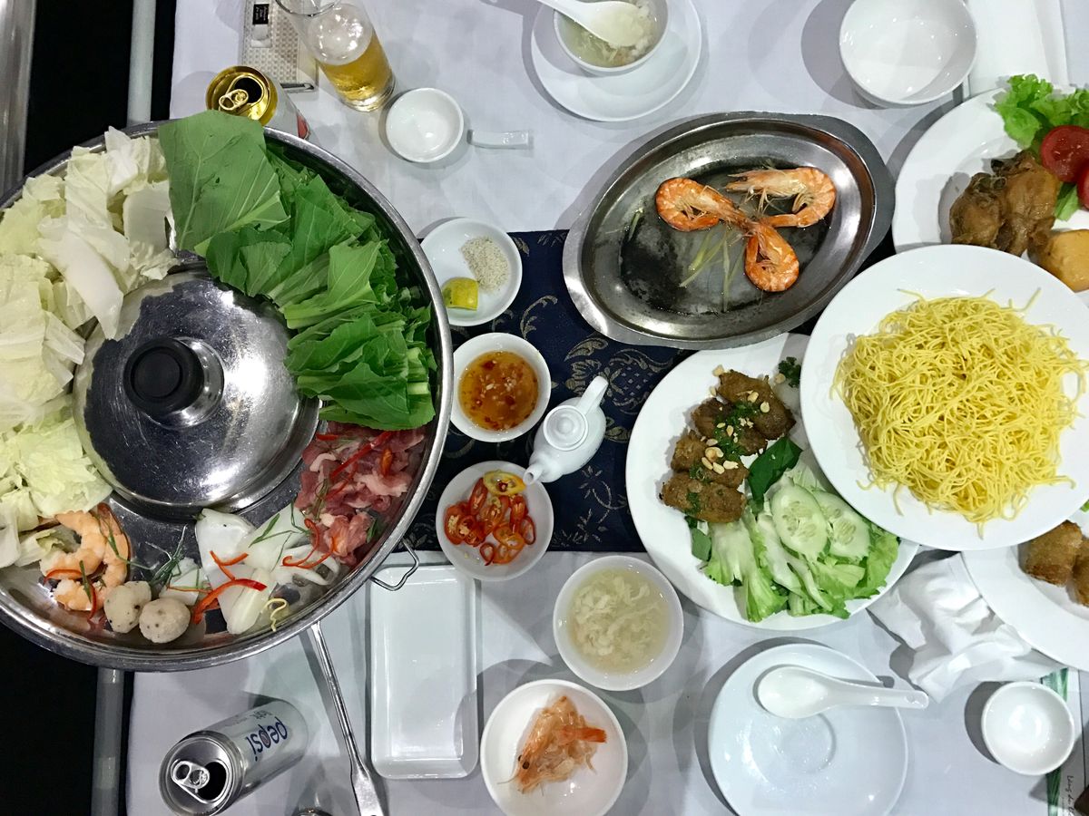 お昼ご飯は大きなレストランでコース料理も楽しみます。すごく大きなお魚を目の前で調理して取り分けで、生春巻きを作ってくださいます。また顔よりずっと大きなふうせん餅を切り分けてくれたり、揚げ春巻き、フォー、チェーが食べれます。お腹は一杯です。