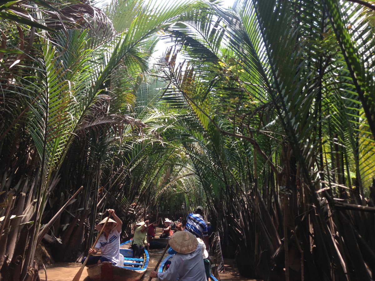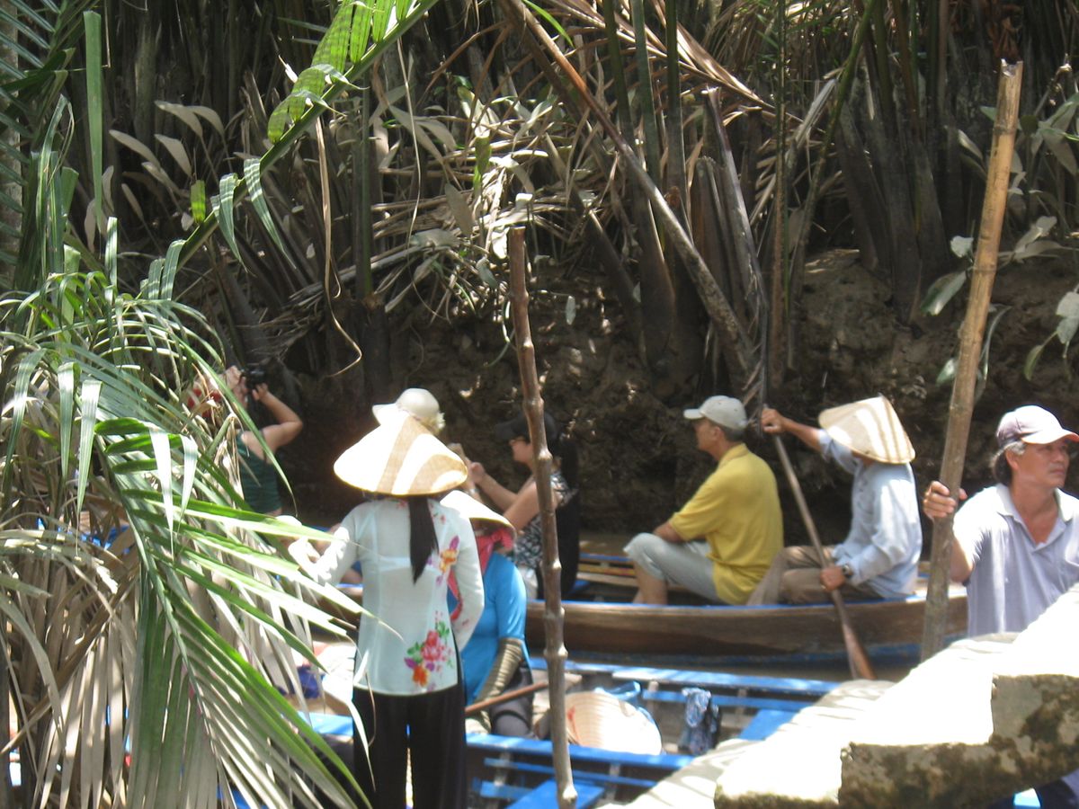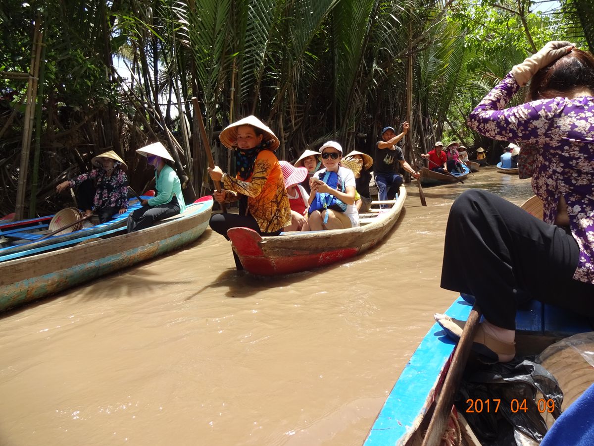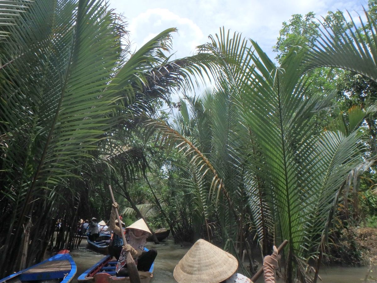 朝8時、ガイドさんがホテルにお迎えに来て、メコン川デルタクルーズへ。2時間という長い道中もガイドさんからベトナムの色んな事情を聞いたり、同じツアーの人達からお土産などの情報をもらったりしているうちにミトーに着き、中洲に渡るための船に乗りました。中洲では、民家の様子やキャラメル工場を見学して、メコン川のデルタクルーズを体験。長い葦(?)が生えている沼地を船頭さん(それが年配の女性!)が巧みなオール裁きで進んで行きました。葦が生い茂っている隙間から見える青空がとてもきれいでした。帰りの船ではサービス?でしょうか、ココナッツジュースももらえました。
