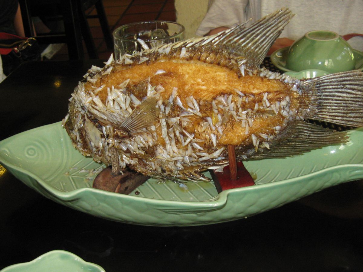 お昼は、象耳魚の料理でした。淡泊であっさりしていて食べやすい魚でおいしくいただきました。まるく膨らんだもちもちょっぴり甘くておいしかったです。