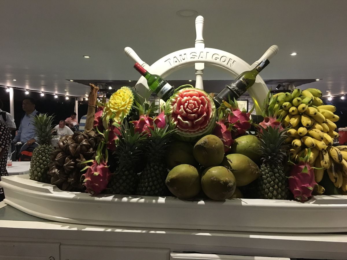 朝、時間通りに宿泊先のホテルにお迎えに来てくれました。大型バスに今回は20 名の参加者だったのでゆったり出来ました。まずホーチミン市内のチャイナタウンにあるティエンハウ寺を見学。お寺についてガイドさんが詳しく説明してくれます。その後ミトーに移動。1時間半の道中昨今のベトナム事情を興味深く話してくれます。ミトーに着くと、椰子の実をその場でカットしたジュースをいただきながら船で中州の島に移動。中州に住む人達の生活を見学し、大蛇をくびに巻かせてもらったり、できたてのハチミツをいただいてココナツキャンディ工場、トロピカルフルーツをいただきその後手漕ぎボートに。ボートを漕いでくれたお姉さんが小さな声で「チップ。チップ。」と言っていたようですが、ガイドさんが何度も「チップはまとめて渡していますから、渡さないでくださいね。」と言ってくれていたので笑顔で無視してしまいました昼食は名物のエレファントフィッシュを含む料理。風船のように膨らんだライスボールがお餅みたくて美味しかった。飲み物だけ別料金でアルコールが飲めないのでせっかくだからとフレッシュジュースを注文しましたが、あまりに美味しくなかった。薄い?ホテルの朝食ビュッフェのジュースの方がよっぽど美味しかったな~食後ホテルに送ってもらうバスの中は皆お疲れで寝ていました。ホーチミン市内に戻ってホテルに送ってもらったり、近くの観光地で降ろしてもらったりと臨機応変に対応していただけるようです。私たちは夜のツアーまで休憩と着替えの為ホテルに送ってもらいました。