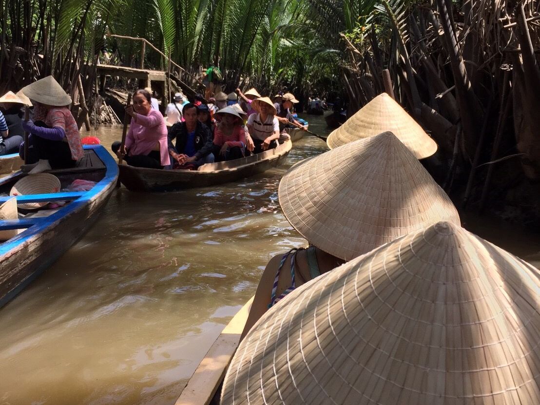 つづいて、フルーツを食べながらのベトナム民謡?!を聞きました。最後は日本語の曲を歌ってくれて盛り上がります!テンションが上がったところでいざ手漕ぎボートでのジャングルクルーズ!ドキドキワクワク!ベトナム帽?!笠?!をかぶって出発!あっという間に終わってしまったが楽しかったぁー。それから、島を離れる船の中ではココナッツジュースを味わう…味はなんともいいようがないけど…雰囲気最高!写真にはいい感じに写るのでよかったです。お腹がすいてきたところでレストランに到着。エレファントフイッシュがお待ちかねしてました。ベトナム料理を堪能して、レストランも敷地が広くて写真スポットもいっぱいあって大満足でした。そして前半の最後はお寺へ行きました。ガイドさんが色々説明してくれて個人で行ってもなかなかわからないことが聞けてよかったです。