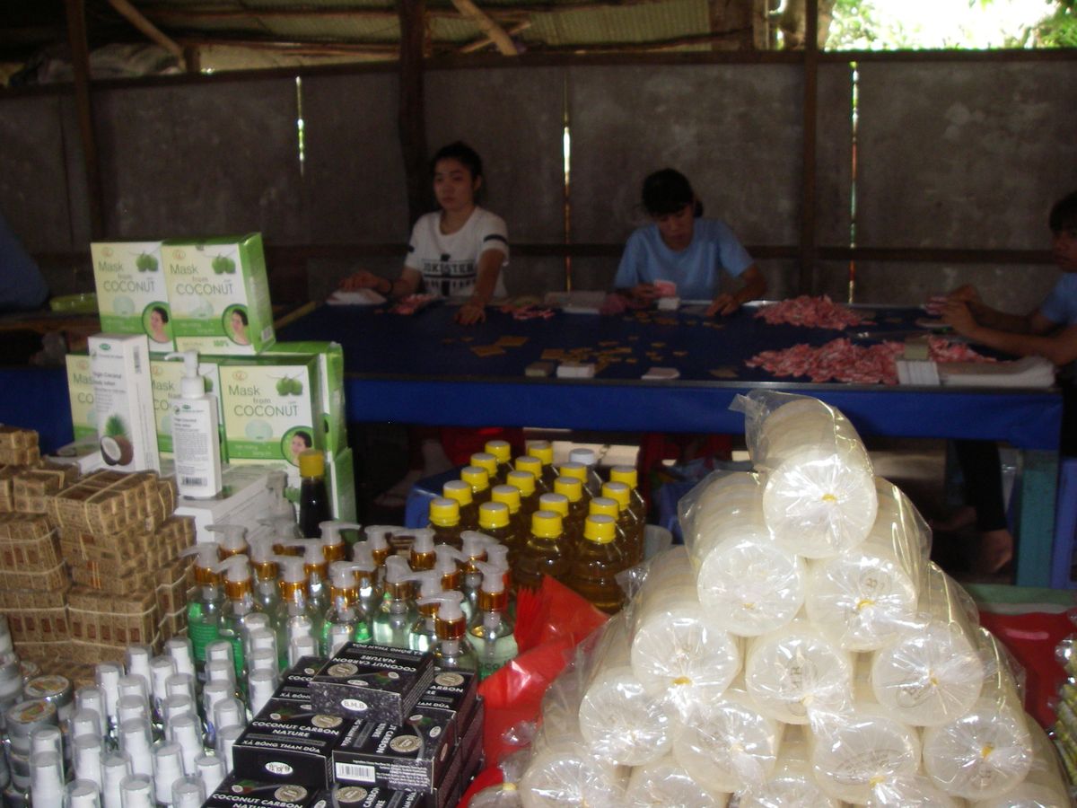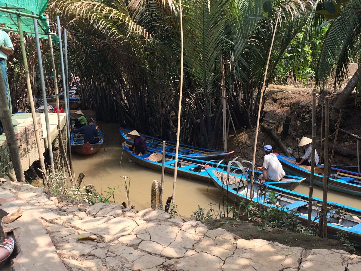 朝は島にあるメコン川で小船(カヌー?に似ている)に乗りました。のんびり優雅というよりは行き交う船の間を通りぬけると行った感覚でした。船だけでなく島全体の雰囲気や途中でいただく、ココナッツのキャラメル、ココナッツジュースなども楽しい思い出となりました。