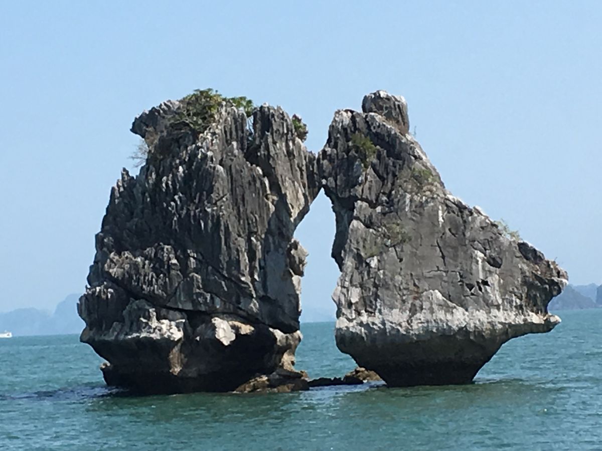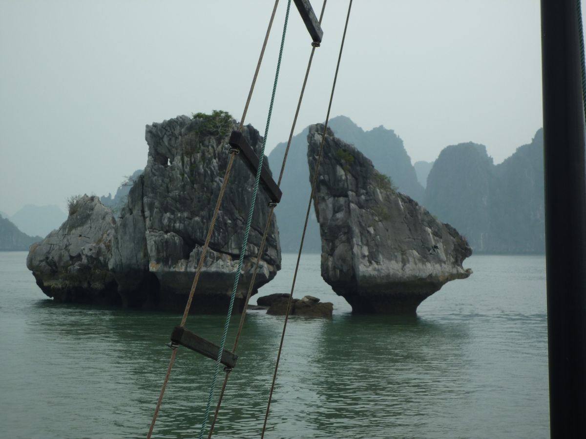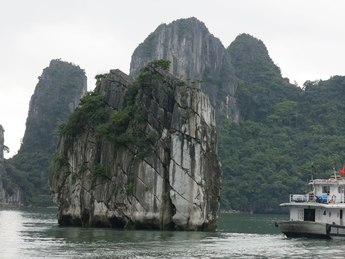 早朝迎えが来てバスで出発しました。いや遠いところです。道も悪いというよりオートバイで混雑していて怖いぐらいでした。ベトナムの運ちゃんはすごい!しばらく走って郊外へ出ると一安心でした。港で船に乗り換えて観光に出発。聞きしにまさる奇岩で楽しい時を過ごしました。食事はまあまあ程度ですが、小舟で魚介を船に売りに来たのでエビなど買いましたがおいしかったです。楽しい時を過ごしました。