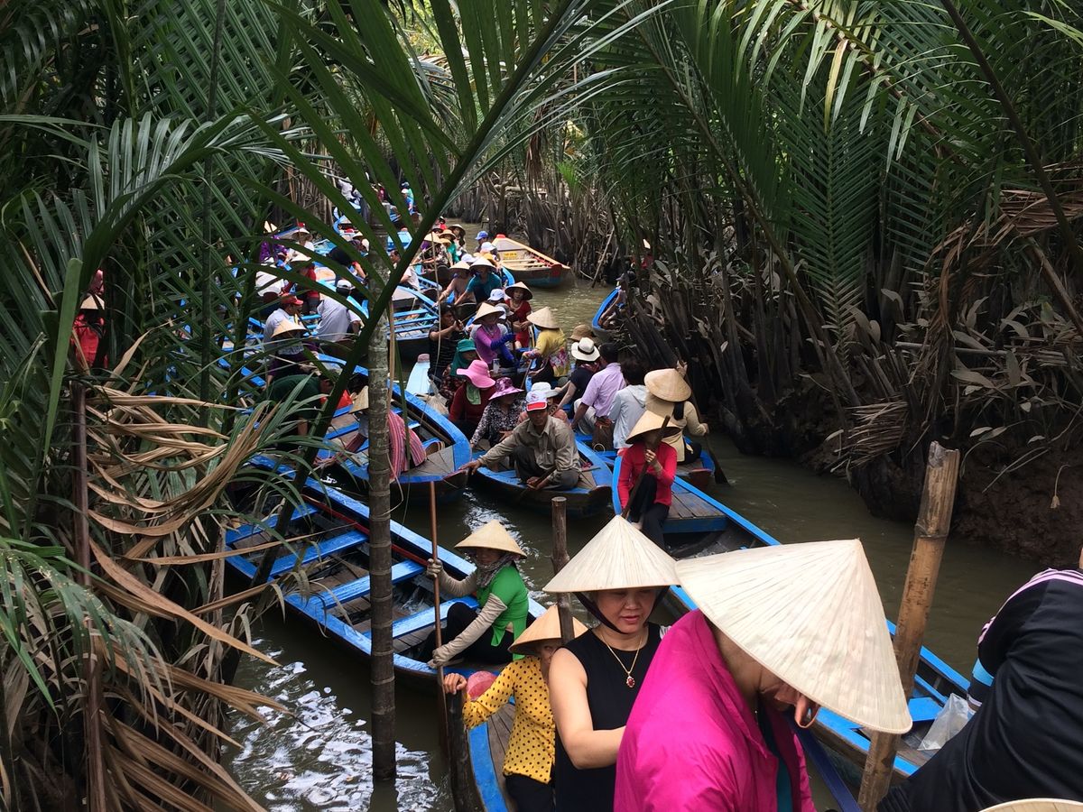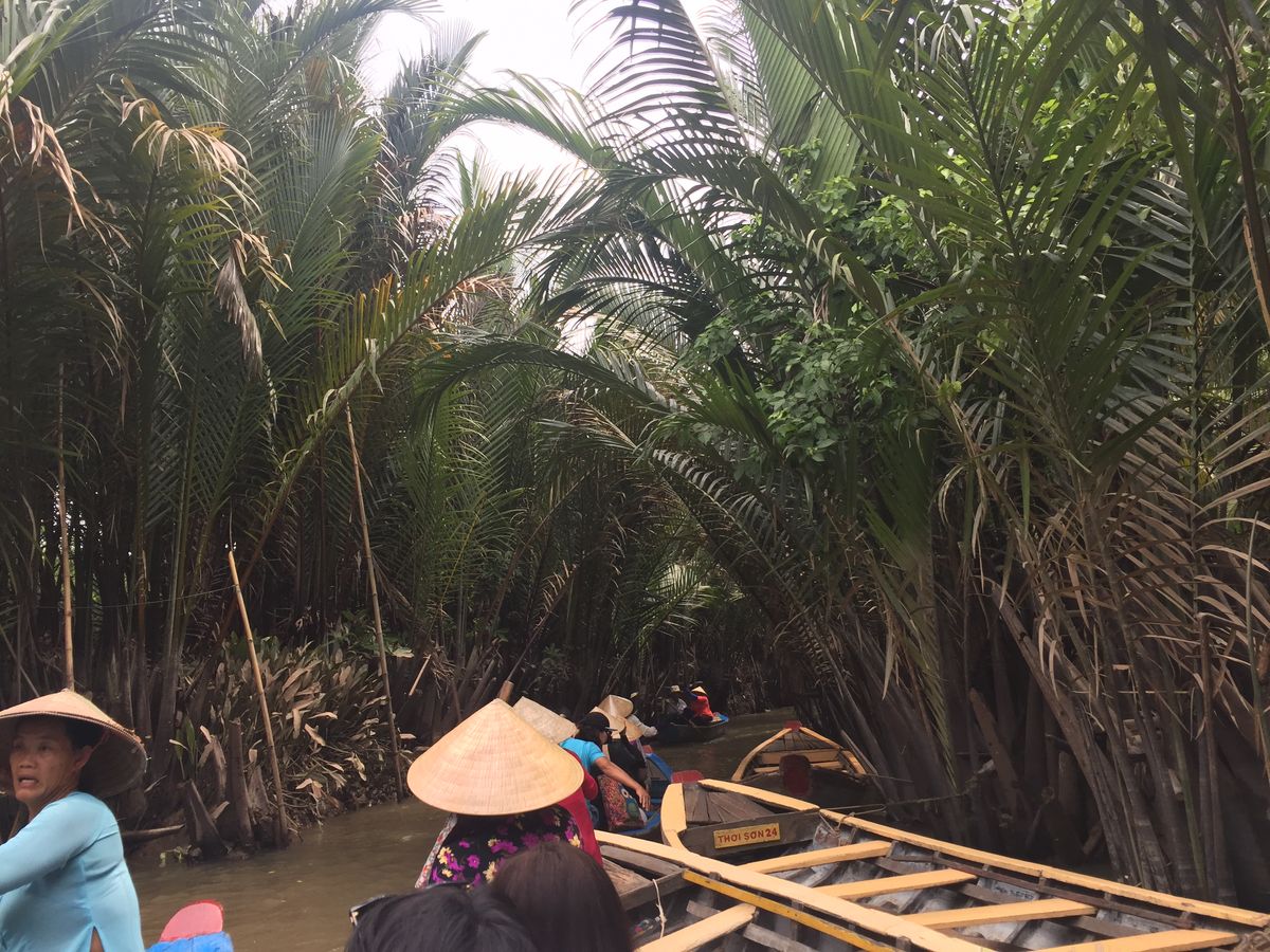 メコン川の川下りはこんな狭い幅を行き来するのかと驚くほど船が交差しますが、バランスをとりながら進んでいくのはとても楽しいです。終わると、船をこいでくれたおばさんにチップを要求されますが、妥当な金額が分かりませんでした。。。