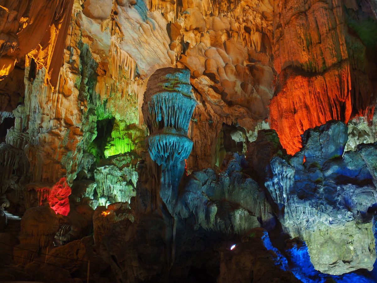 お写真からは、あいにくのお天気のように拝見しますが、とてもきれいなお写真ですね。ライトアップされた鍾乳洞のお写真も、素敵でございます。