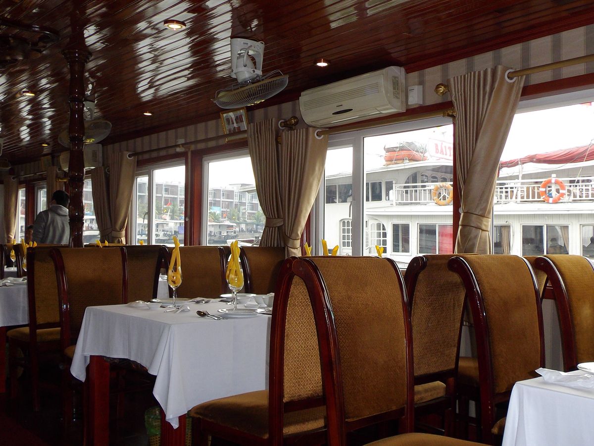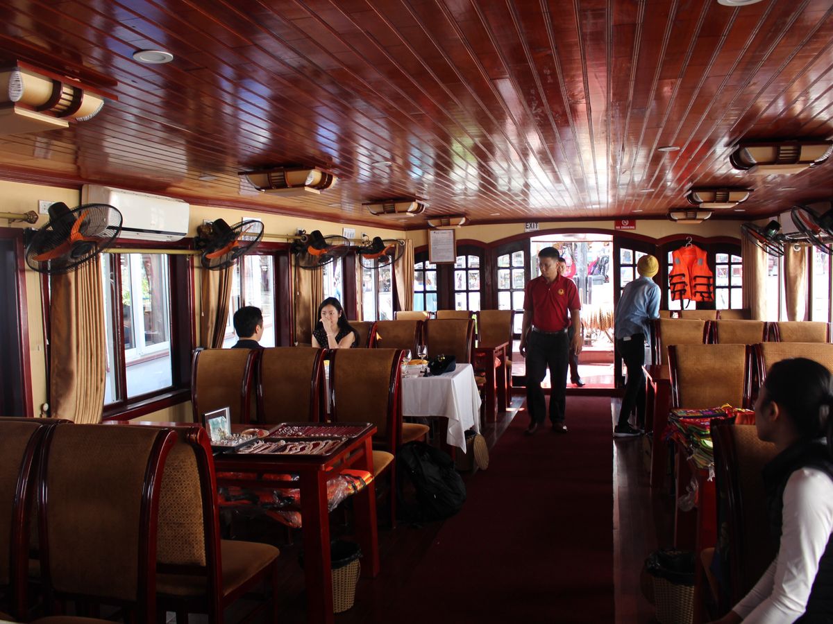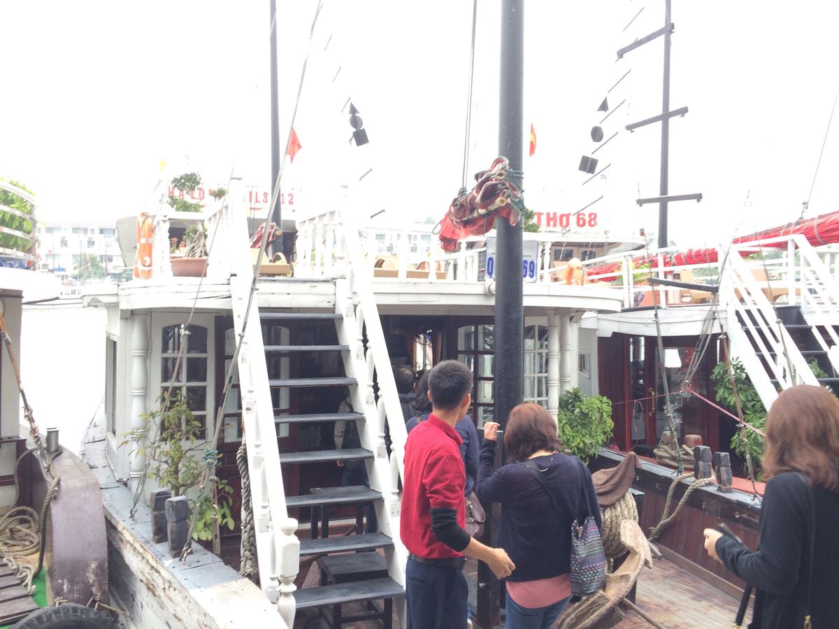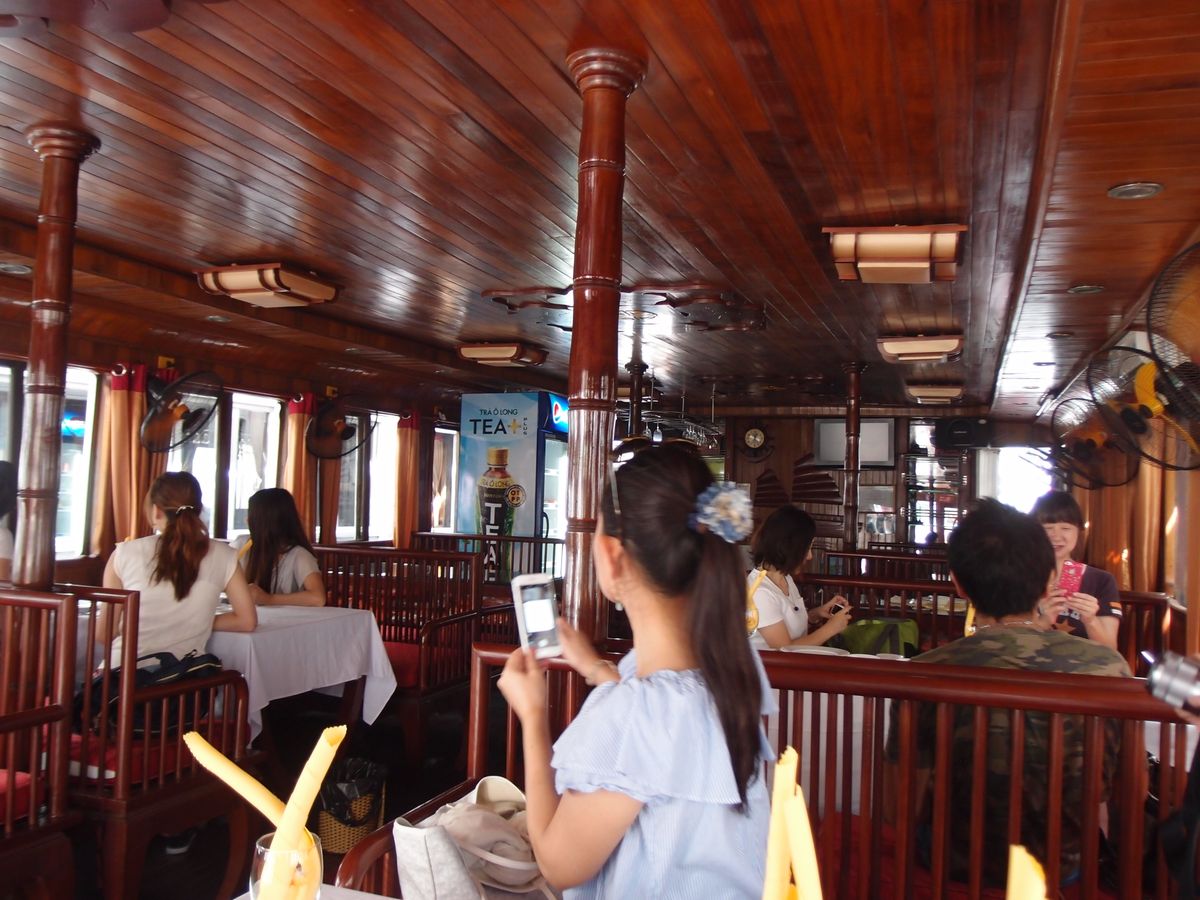 当日は道が混雑していたのか、予定時間から少し遅れてお迎えが到着しました。バスはきれいな大型バスで、ガイドさんも日本語が上手な楽しい人でした。船内でお昼のシーフードコースを食べながらのクルージングです。料理も美味しく、ちょうどいい量でした。男性には少し足りないかも。途中で売りに来るシャコや牡蠣などは、ベトナム価格を基準にすると少し割高かもしれませんが、日本よりはお安く食べられます。景色がきれいなポイントでは、船外にでて景色を見て、出たり入ったりしながら食事をします。道中はトイレ休憩を兼ねて、行き帰り1件ずつお土産やさんに寄ります。値段は街中より高めです。帰りの店はお菓子類がメインですが、刺繍巾着などの小物もあります。巾着はガイドブックに載っているような街中のちょっとおしゃれな店とあまり変わらない値段でした。無理に勧められることはないので、私はトイレだけすませてブラブラ見るだけでした。鍾乳洞は階段を上がったり降りたりします。それほどきつくはないですが、自信がない人は船に残ることもできます。鍾乳洞の見学後は、また同じ船で帰ります。バス移動が長いので、道中はだいたいみんな寝ていたように思います。