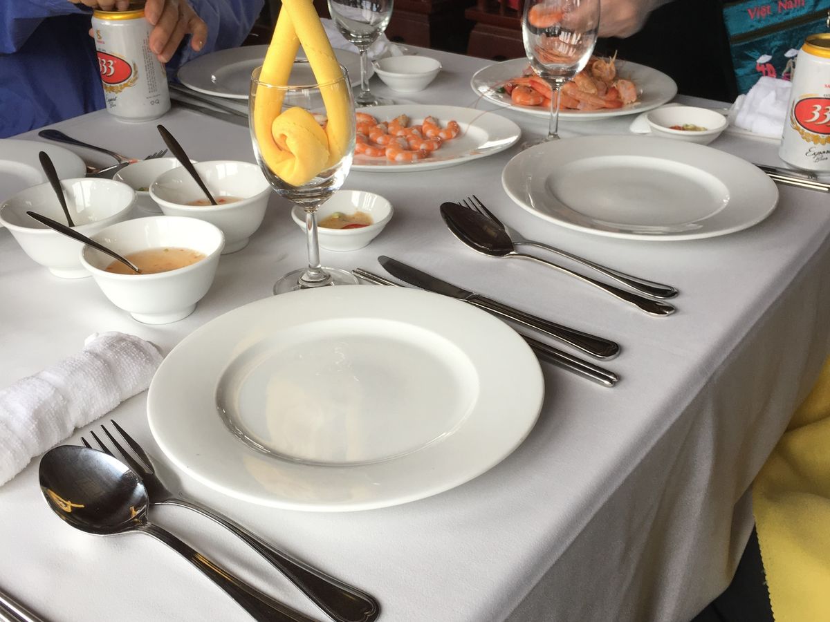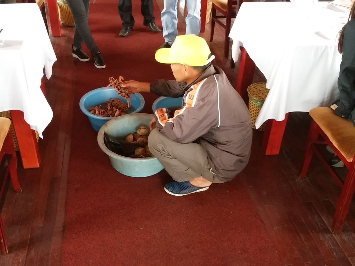 最初の皿が出てきたときに、漁師がハマグリ、シャコ、牡蠣を売り込み、少々高いとは思ったけれど、折角なのでと、みんな何かとオーダー。うちのテーブルはみんな揃ってハマグリ。2人x3組で少し情報交換したり会話を楽しむチャンスでもあった。食事中にハロン湾名物の奇岩があり、席を立っては写真を撮るのはちょっと落ち着かなかった。船上生活の物売りが来るかと思ったが今では少ないよう。それよりはクルーズ船のスタッフから飲み物、土産物(真珠、テーブルクロス、刺繍とか)次から次へと商売熱心であった。
