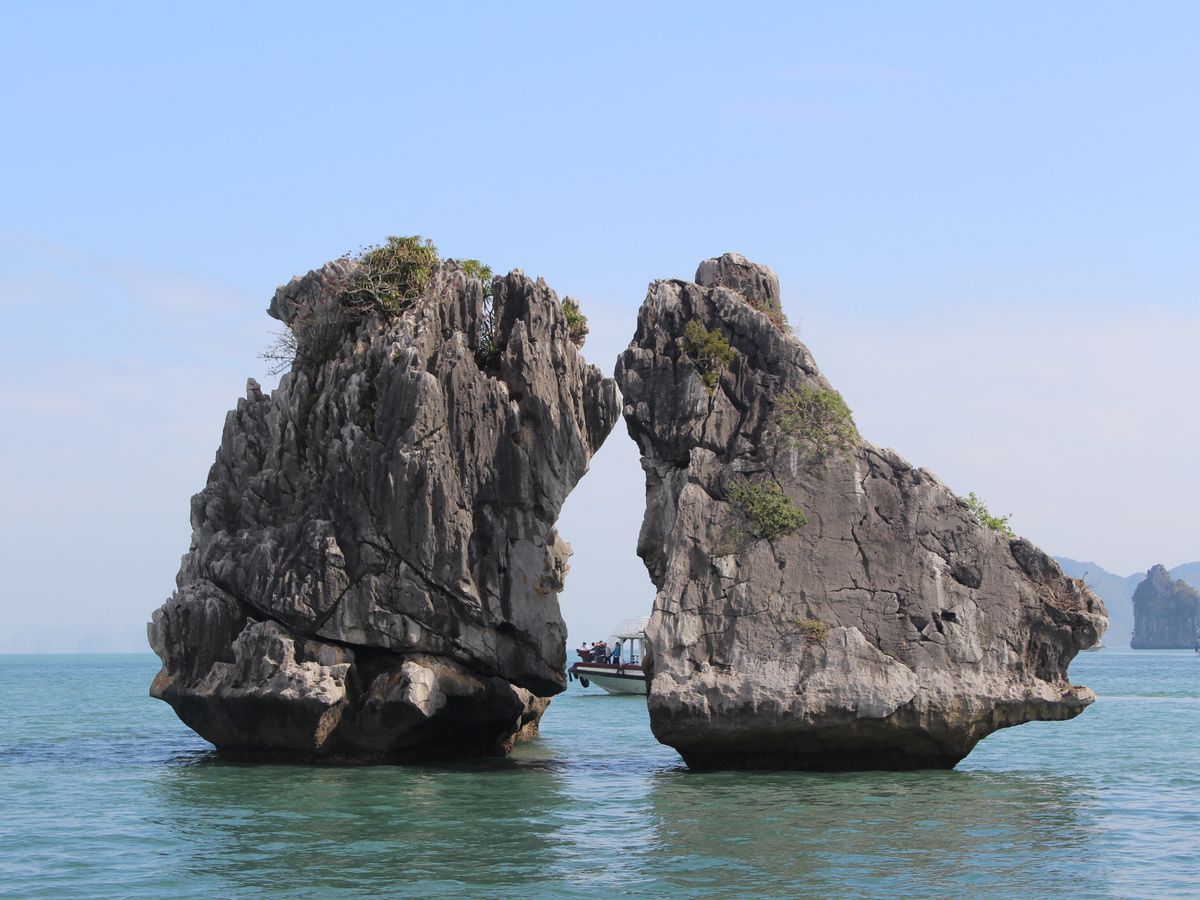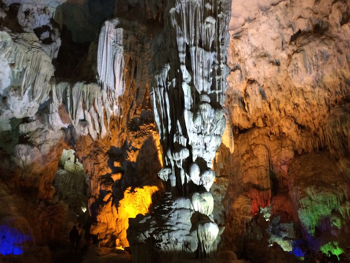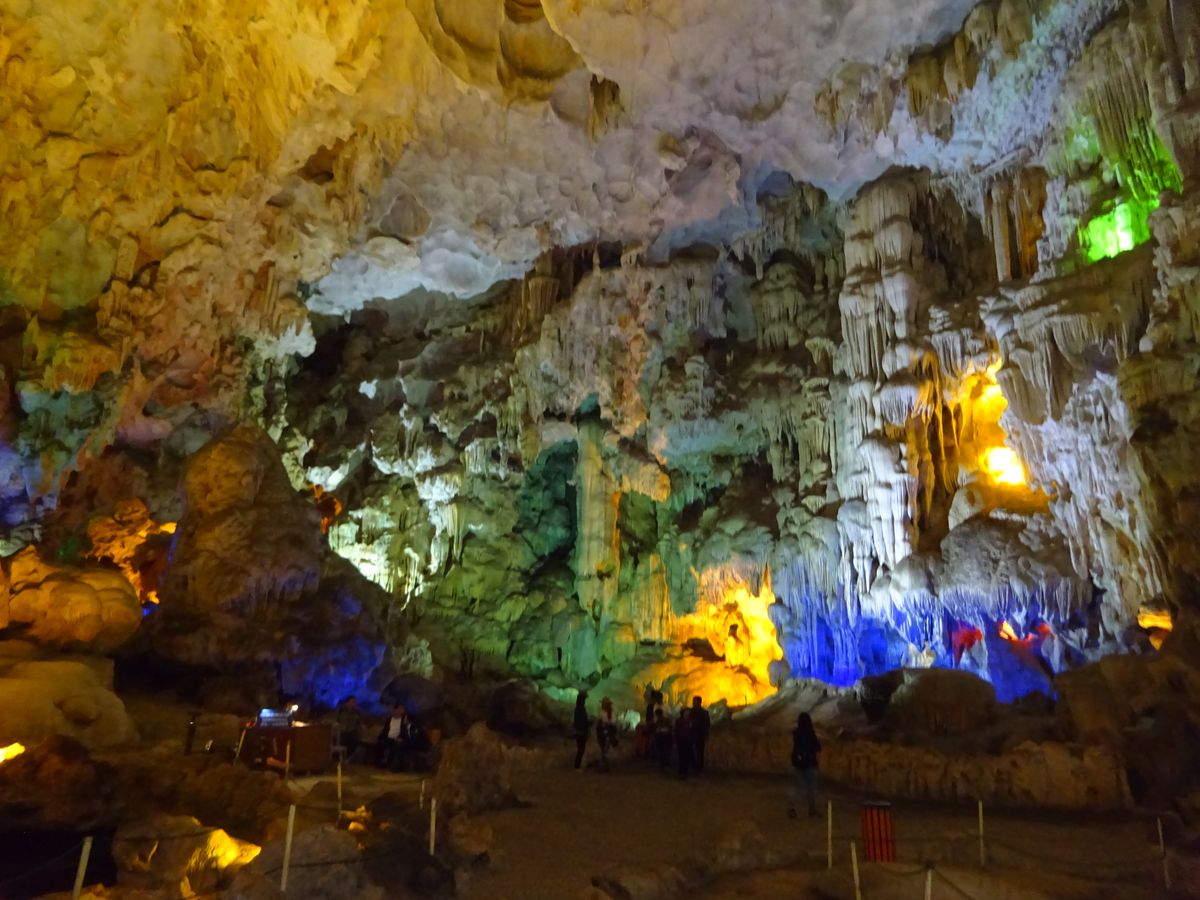 クルーズでは、有名な香炉岩、夫婦岩(闘鶏岩)を目の前に見つつ、進んで行きます。船の上に出たりするのは自由だし、波は穏やかなので、世界遺産のど真ん中を、風を感じながら、とても気持ちの良いクルーズでした。そして、ティエンクン鍾乳洞。ライトアップが派手で面白かったけど、スケールの大きさや、歴史を感じる佇まいに、感動しました。中は一年通して20℃以上あるという、日本の鍾乳洞とは違う環境でしたが、暖かく歩きやすかったです。日帰りツアーなので、ハロン湾を高台から眺望することは出来ないので、高いところから観たい人は、ゆっくりとしたスケジュールで行くと良いかもしれません。
