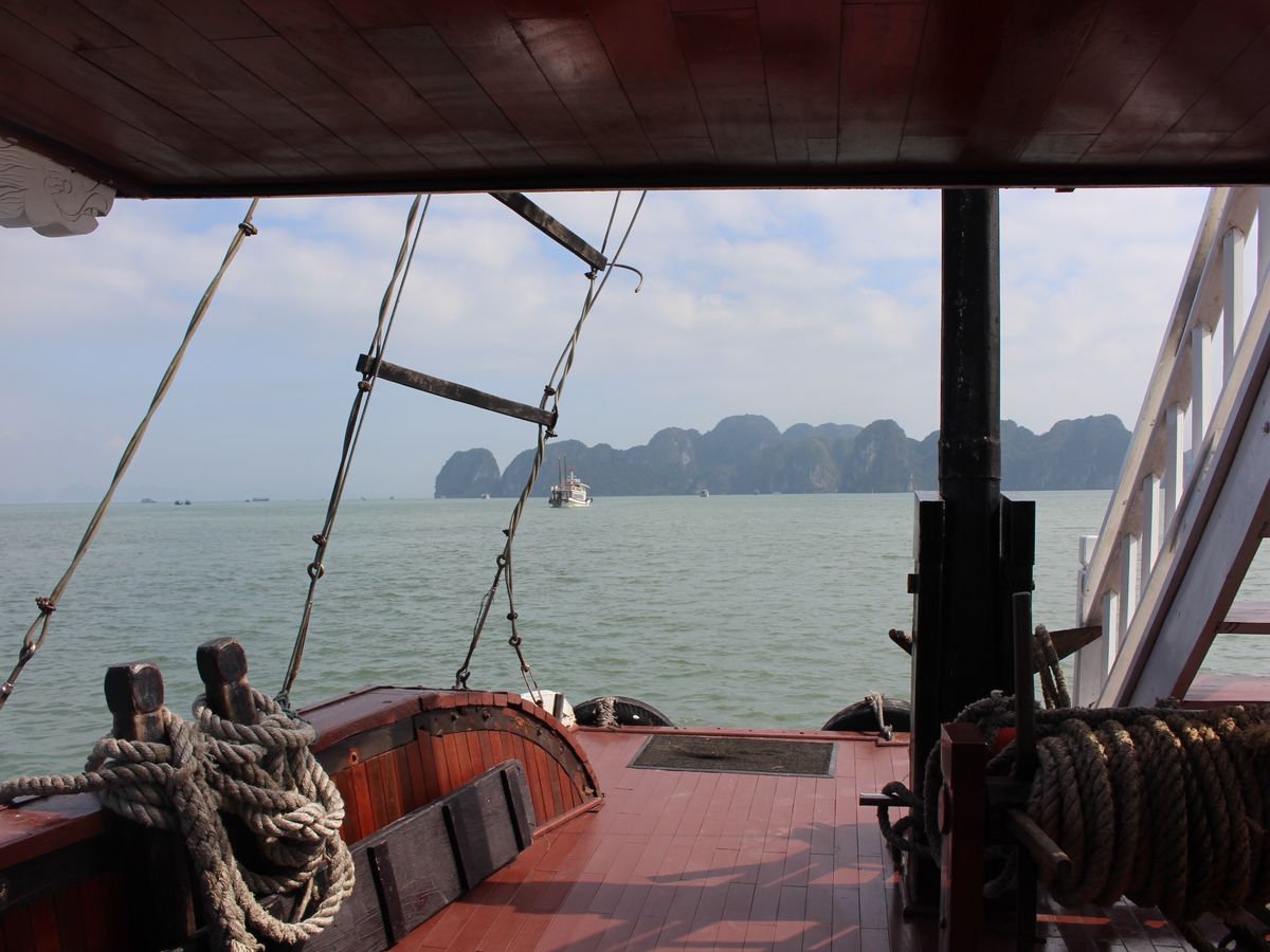 内容はハロン湾の岩の間をトータル3~4時間ぐらいクルーズするのがメインで、船のデッキで横になりながらのんびりした時間を過ごせ快適でした。