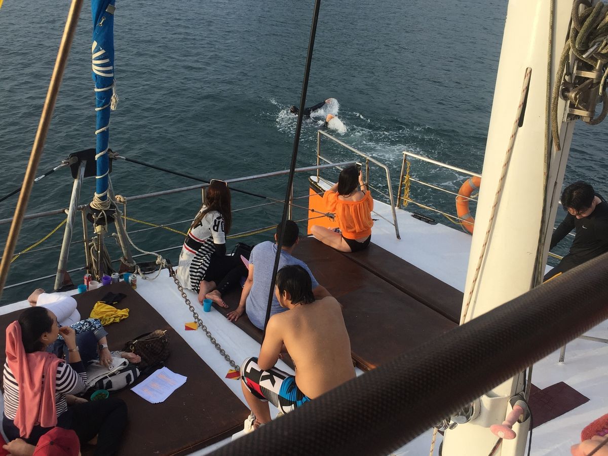 送迎は15分遅刻。船は予定通り出航。強制はされないが海に飛び込みさせたがる主催者。サメがいるかもしれないから、安全面はちょっと疑問。食事はシンプルなものばかりで、サテーだけが美味しかった。あまり食事は期待してはいけないサンセットクルーズだった