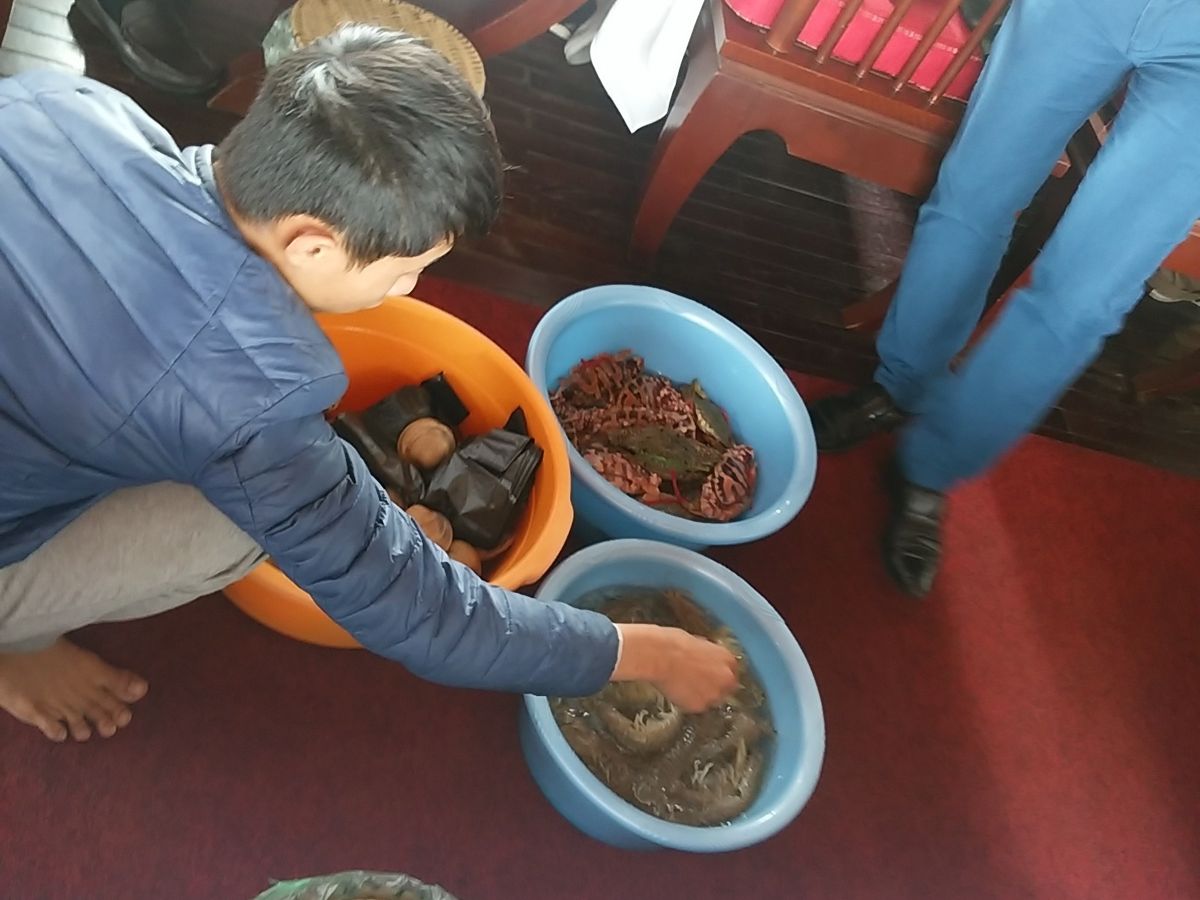 食事がはじまるとすぐ海産物売りの船が接舷し、大浅利?、カキ、 大シャコ、かにを売りに来ます。ガイドさんが特大シャコを私たちに見せようと不用意にバケツに手を突っ込みハサミで挟まれケガしてました。