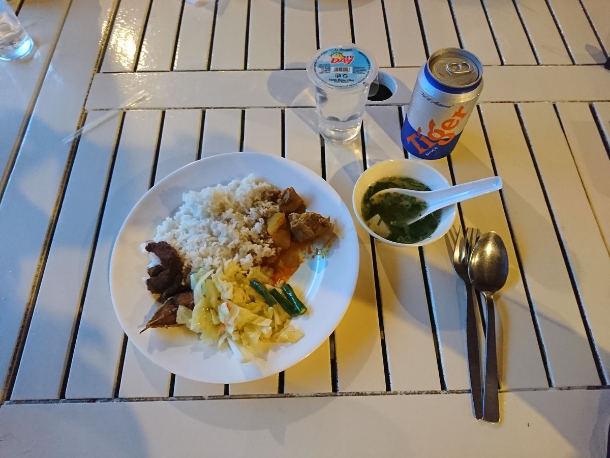 昼前に着くかと思ったが12時半過ぎ乗船。すぐにランチが始まる。6人で1つのテーブル。メニューは茹でエビ、アサリの炒め物、揚げ春巻、カニの甲羅揚げ(さつま揚げ)、イカと野菜の炒め物、揚げ魚、ご飯、キャベツの炒め物、バナナ。味はあっさりとしていて美味しかった!