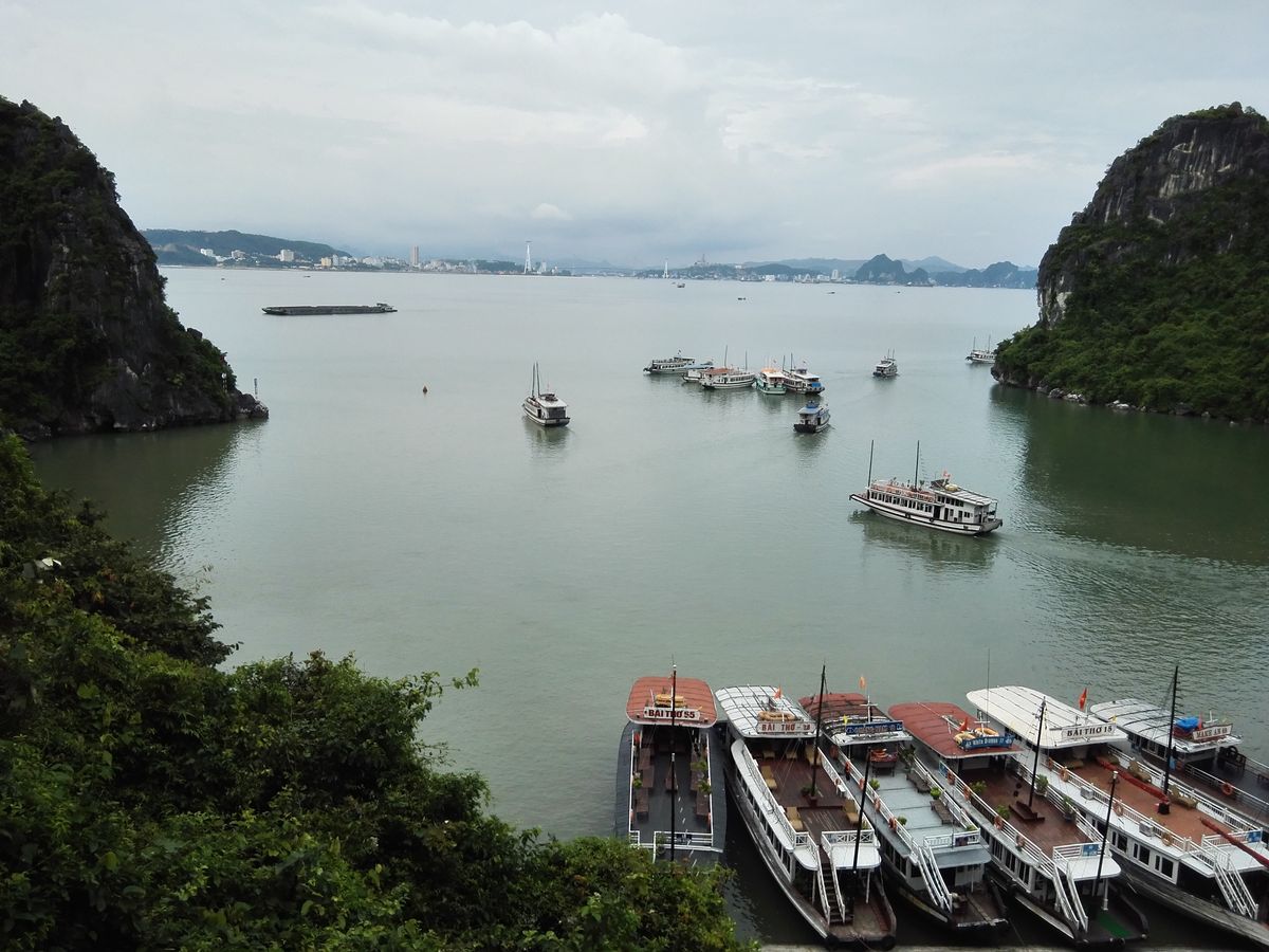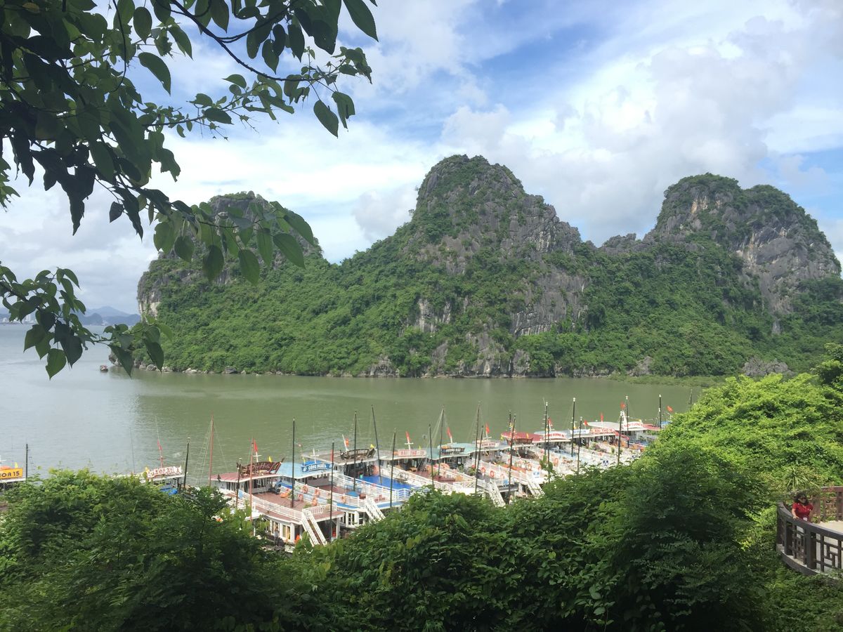 ハロン湾へは中型バスにて4時間。片道1度のトイレ休憩を巨大な土産物屋で。得に買う必要なし。ハロン湾では、まず貸し切りの大きなクルーズ船に乗り込み、シーフードランチを頂いた。島々がすぐ近づくので、ランチをゆっくり楽しむ暇はない。美しい景色を見ながら1時間程乗り、海に浮かぶ船着き場へ到着。ベトナム人おばさんが後方2本のオールで漕ぐ4人乗りのバンブーボートという小型ボートに乗り込む。2人乗りのカヌーも選べるが、こちらは濡れる可能性があるそうで、水着に素足でと言われた。写真をしっかり撮りたくて小型ボートに。小舟でしかはいれない美しい秘境を30分ほど楽しむ。ここがハイライト。そして元の大きなクルーズ船に戻り、行きと同じ道で帰路につく。帰りも一度お土産物屋でトイレ休憩あり。