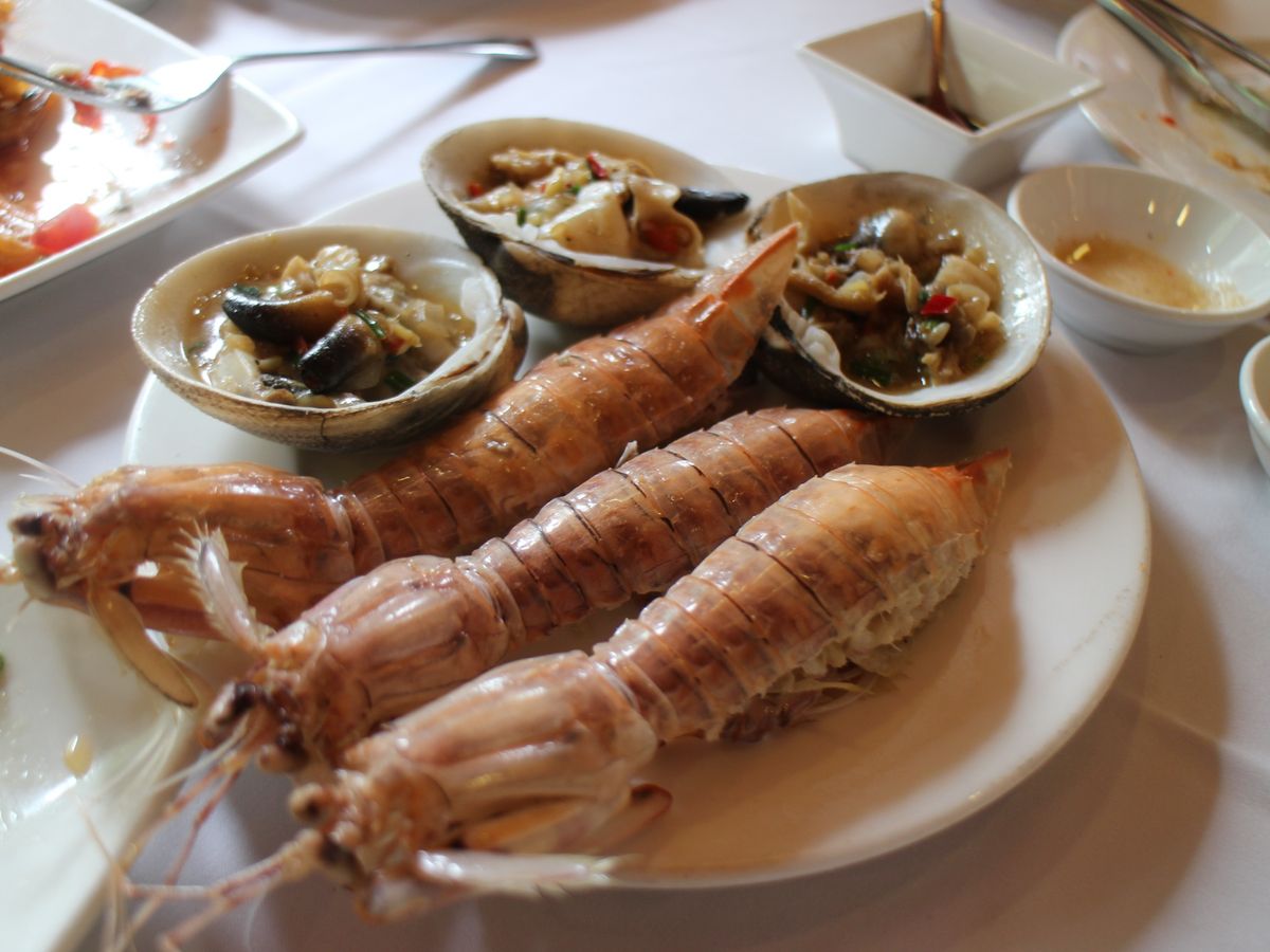 大人四人の方と相席することになり、私たちを含め大人五人プラス子供二人の一テーブルに中皿くらいの大きさの料理が一皿ずつゆっくり運ばれていきました。どう考えても量が足らず、最初の海老炒めは二本ずつ、次のイカ炒めは3片しか食べれず、その他も料理は何品か出ましたが、皆で少ない料理を気を使いながら食べました。また、子供は食事が含まれてません、とガイドに言われ、かに等1人一つ分ある料理は私一人分しかもらえず、9歳の子には代金払ったのに、1人分の食事もなかったです。子供の食事が含まれてないとは知らず、ひもじい旅でした。ガイドは子供が好きじゃないみたいで、子供が話しかけても何度も無視されました。