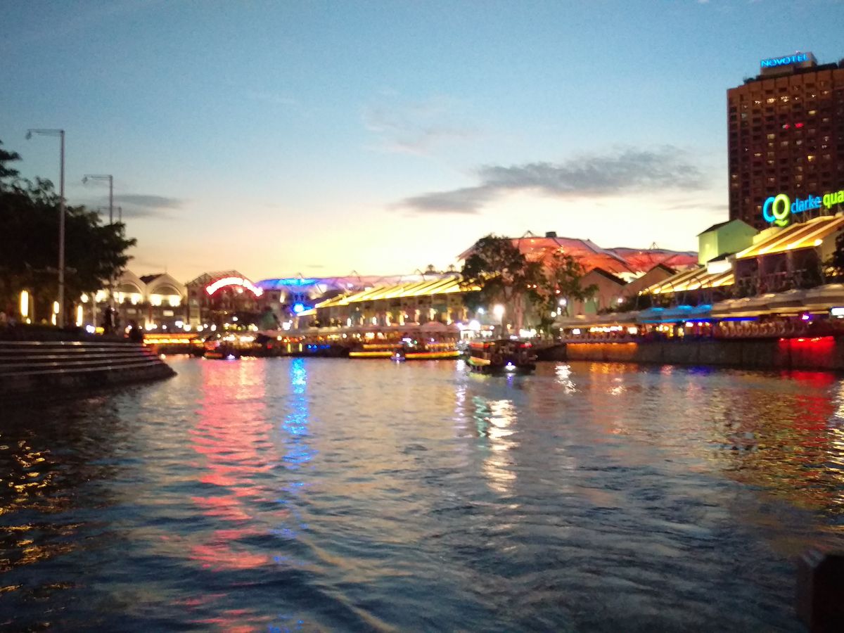 食事が終わるとリバークルーズの乗船場になっているクラークキーに移動します。その場所は人工的な美しさですが中々素晴らしい景色です。夕暮れ時になると観光船に乗り、周囲の風景を堪能することができます。香港の夜景もなかなかのものですがそれに劣らず素晴らしい夜景です。15分位でマーライオンのある公園にて下船となります。