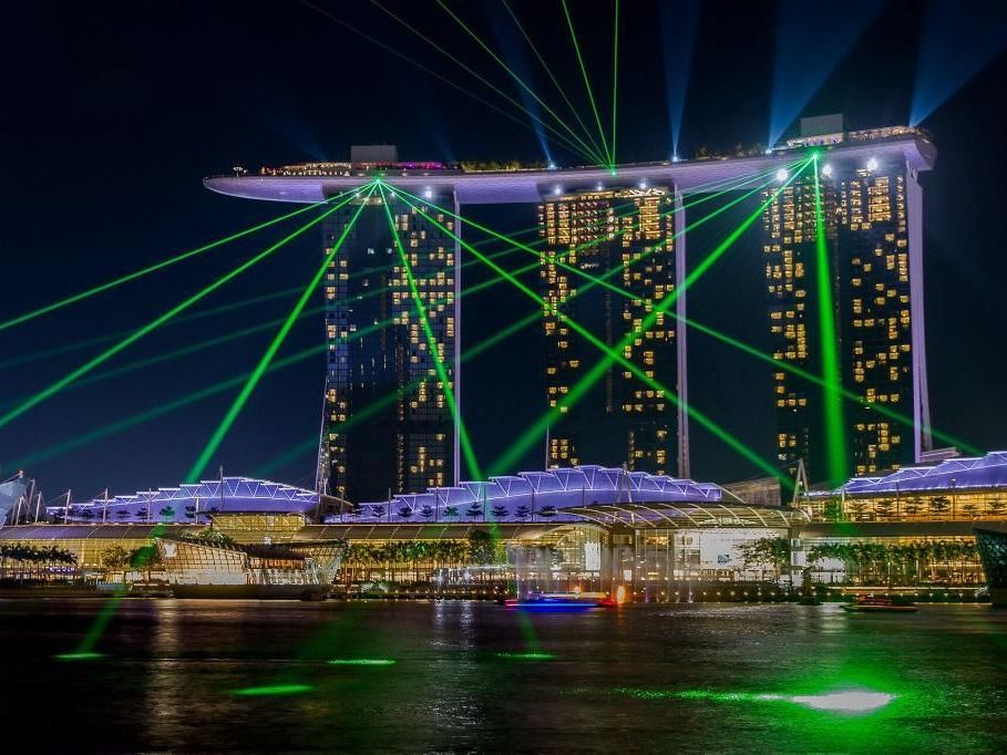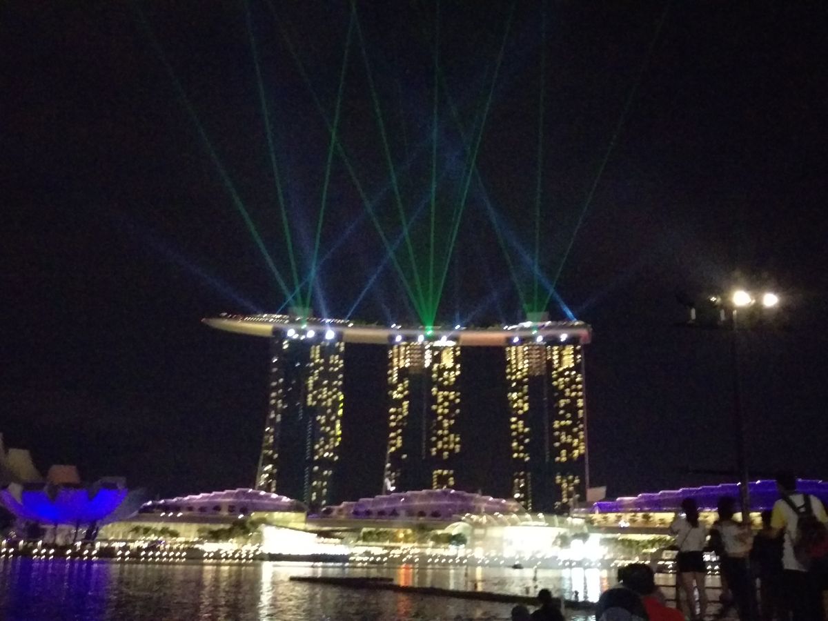 しばらくして20時ころだったと思います。対岸のマリーナベイサンズからのレーザーショーが始まります。綺麗です。
