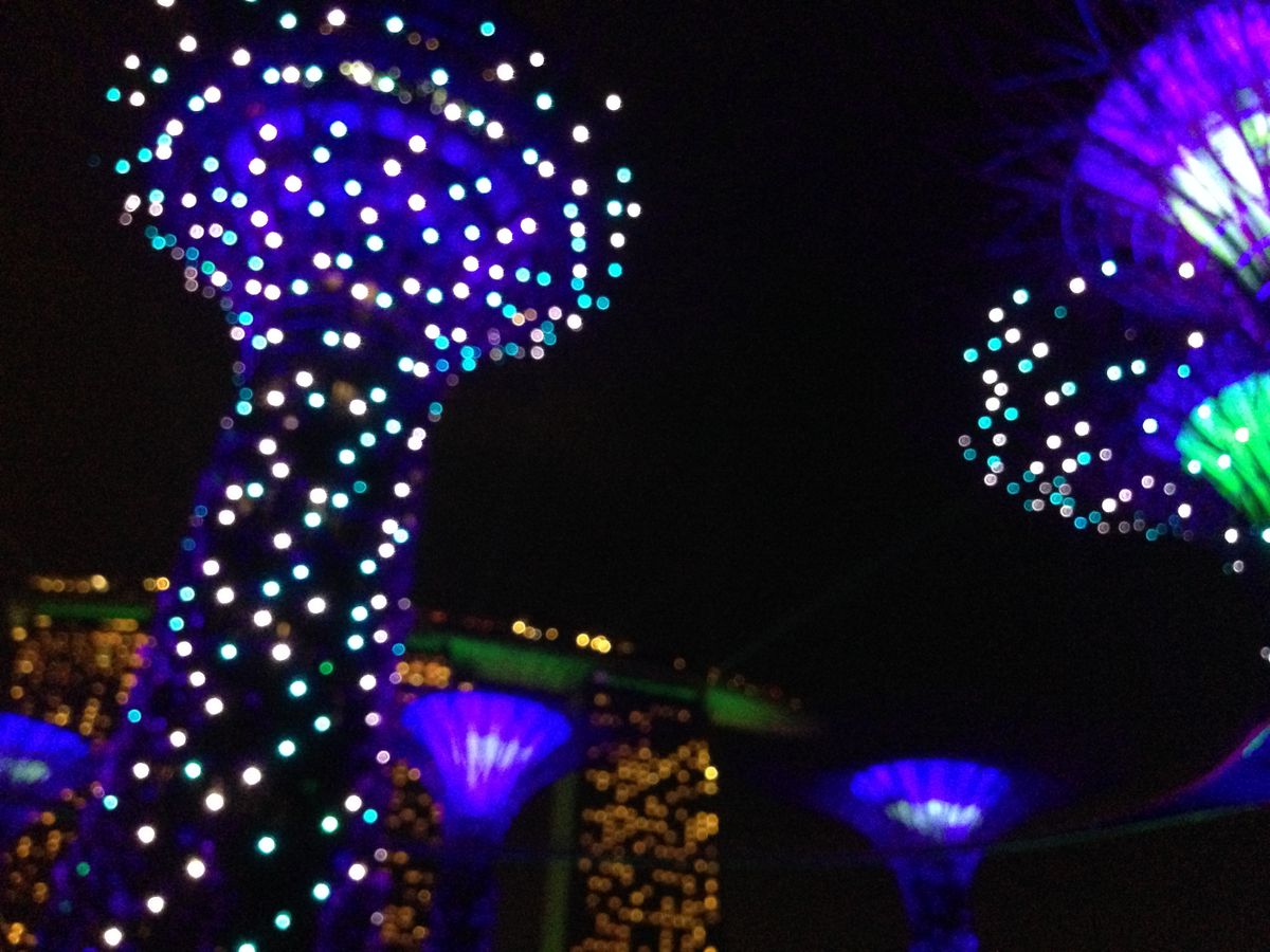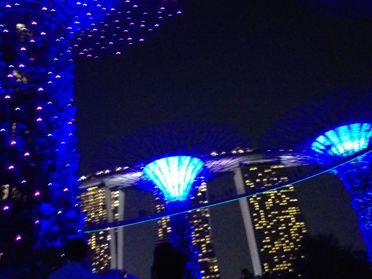 終了後、最後の観光地であるガーデンズ・バイ・ザ・ベイを訪れます。20時45分頃だったと思います。光のショーが開始します。空のほうを見上げながら音楽に合わせてイルミネーションが次々と変わります。これは前のレーザーショーよりも遥かに見応えがあります。15分位で終了します。