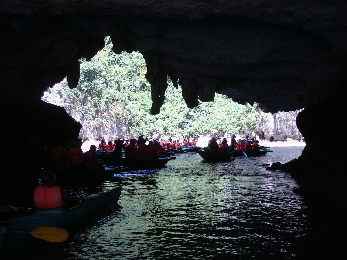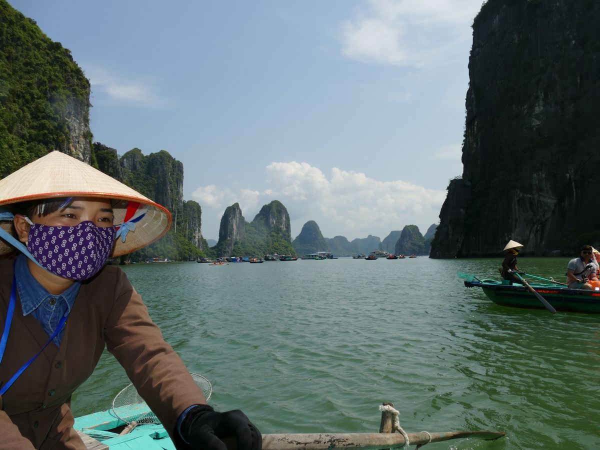 その後,自力のカヤックか,船頭さんがいるバンブーボートの選択(私たちはバンブーボートを選択)をして,湾に出ます(約40分).船頭さんが観光スポット(洞窟等)に連れて行ってくれました.言葉はベトナム語だったので,何も分かりませんでしたが,ジェスチャーで「ここで写真を撮れ(たぶん・・・)」と教えてくれたり,私たちの写真も撮ってくれました.日傘も貸してくれました.その後,鍾乳洞に行きましたが,中は階段・坂と全て徒歩なので,歩きやすい靴の方がいいです.日本の鍾乳洞のように涼しくないので,「ひんやり」を期待すると裏切られます・・・.ガイドさんが中を案内してくれて,5~6箇所に立ち止まり,解説をしてくれました.ただ,ライトアップの色はどうなんだろう・・・赤・緑とか原色揃い.その後,往きと同様30分のトイレ・お土産屋さん休憩付きの岐路につきました(トイレは帰りの方がキレイ).