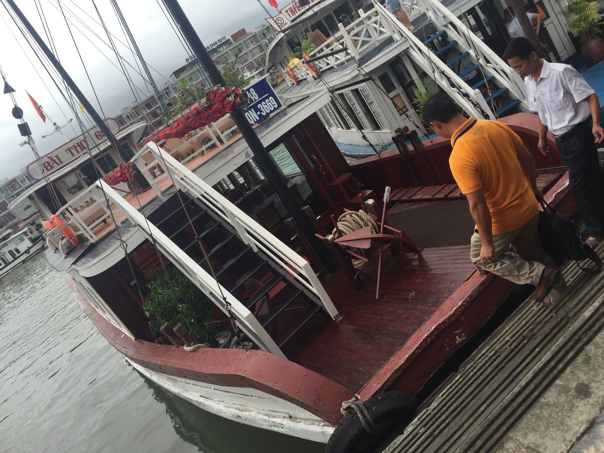 ハノイのオペラハウスで待つこと15分、少し不安になる中、電話で問い合わせしたら他の人のピックアップで少し遅れるとの事、間もなくバスが到着しました。ピックアップ対象外のホテルだとオペラハウスでのピックアップとなり、最後になるので、時間は節約できますが、バスの席はラストチョイス。私は後方座席だったので、道中の路面が悪い所でのバウンドが結構きつくて、腰が痛くなりそうでした。ガイドさんの英語は聞き取りやすく、ハロン湾に到着してから乗った船もとても綺麗に清掃されていて、お食事もお昼としては満足。ビールも1缶フリーでついていました。お食事は結構テキパキ食べないと、あっという間にハロン湾の中に入り、闘鶏岩に着きます。そこからかつては船上生活をしていた人たちがいた所へ、小船を漕いでくれたお姉さんはとってもチャーミングで、鼻歌を歌いながら漕いでくれました。鍾乳洞もとても綺麗でした。欲を言えば、もう少し鍾乳洞をゆっくり見たかったです。往復の時間がもう少し短くなれば良いのですが、こればかりはベトナムの道路がもっと整備され、交通事情が良くならないと解決はしないかもしれませんね!帰りはホアンキエム湖の湖畔で降ろしてもらったのですが、周辺の夕食スポットとかの簡単なガイドマップ等を配って頂ければ、よりよかったかも・・・私は英語がある程度出来るので良いですが、英語にまったく自信のない方は、日本語ツアーを利用された方が良いかも!逆に昼食の時に日本人で固められてしまったのは、私にとっては英語ツアーに参加しているのに、ちょっと残念な感じでした。ハロン湾に行く途中、往復一回ずつ休憩するのですが、刺繍の絵とか彫刻、宝石などが売っていました。刺繍の絵は確かにあまり他では見ないお土産かもしれませんが、お値段もそれなりなので、良く考えて買えば良いかと・・・宝石もとっても安かったので、一つ試しにエメラルド(と言っていた?確かに台はシルバーだと言っていましたが、石については明確な表現がなかったかも?)のペンダントを買ってみたのですが、やっぱりスワロフスキーでした。お値段を考えると当たり前ですけど・・・!