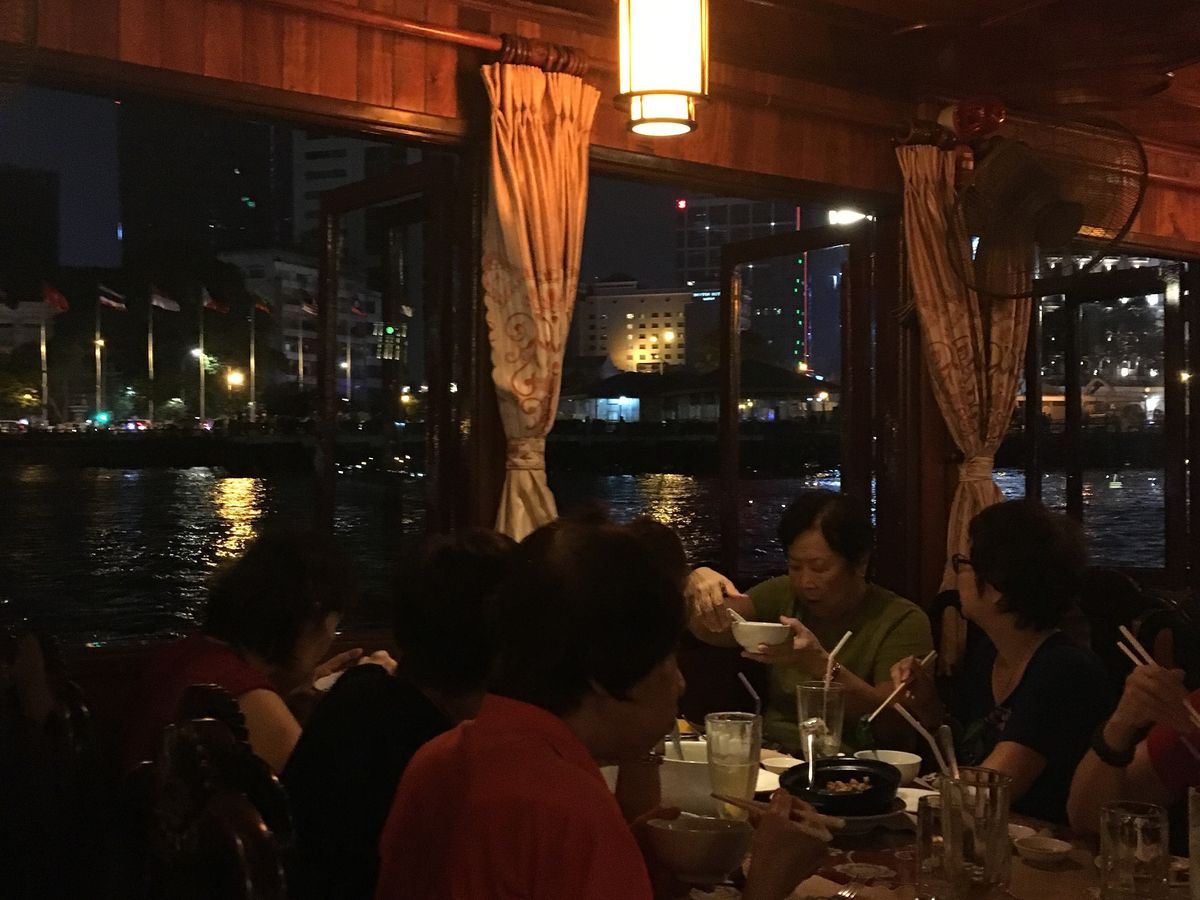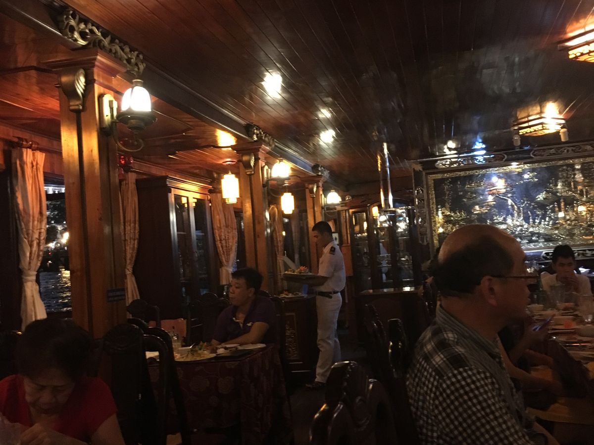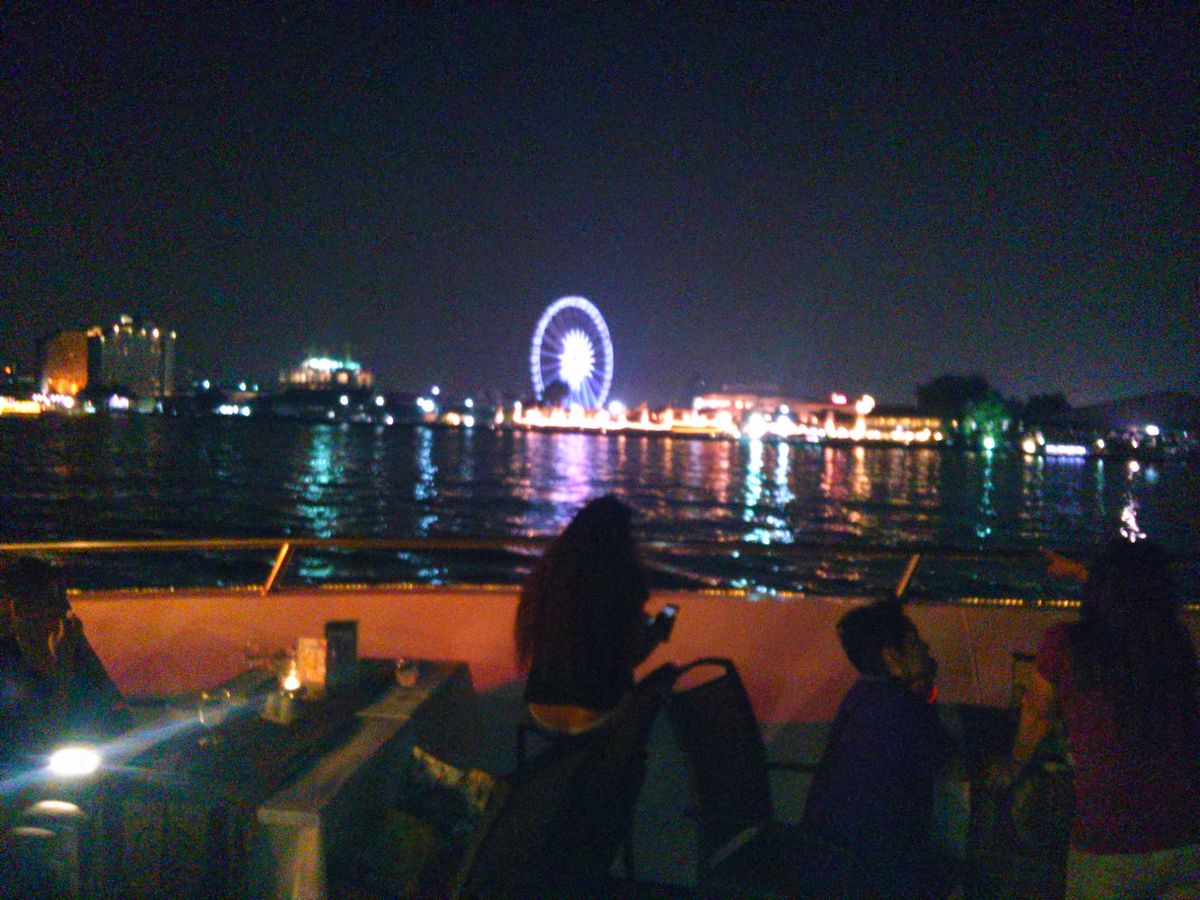 ディナークルーズ船はとても大きく、各国からの観光客であふれていました。冷房がないので、窓際の席にしていただいて良かったです。コースが日本人としては食べきれないくらい出てきて、かなり残してしまいました。。もう少し少ないコースがあればと思います。